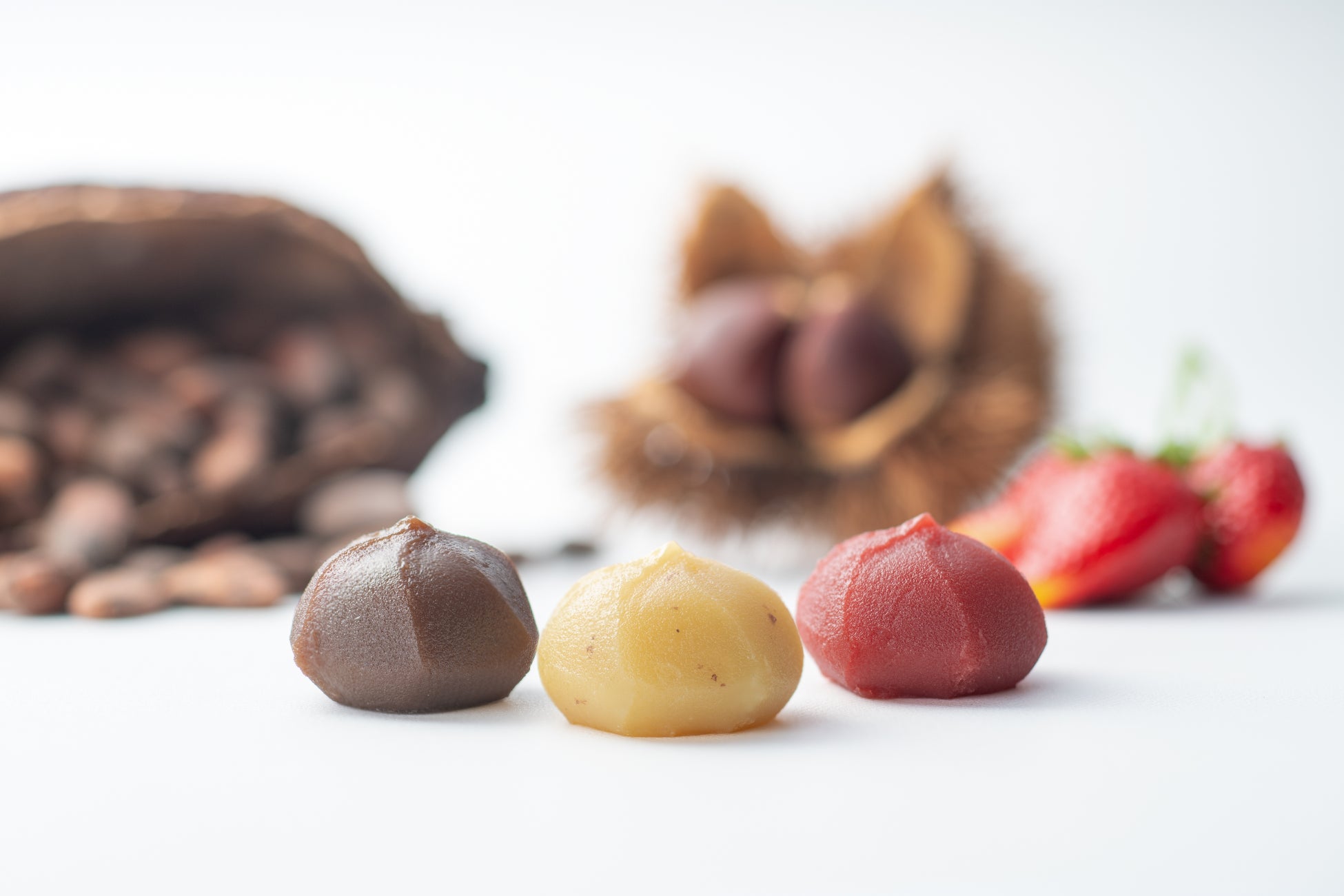 「燦マロン餅」「燦いちご餅」「燦チョコ餅」は、いちご・カカオ・栗といった太陽の光で育つ“太陽の実”に着目し、“あん”の奥深さを主役に据えた3種の餅菓子です。