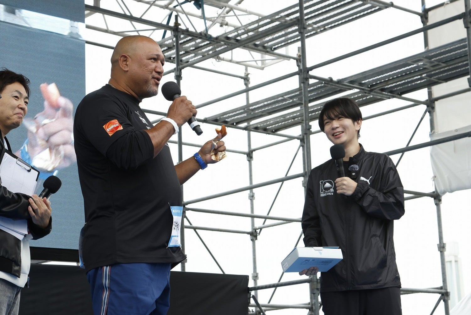 そして今回、横浜出身の髙橋優斗さんが代表取締役社長CEOを務める横浜バニラ株式会社のフラッグシップ商品「塩バニラフィナンシェ」が大会名物「ラッキー給食」に選出。さらに、「ラッキー給食総選挙」1位を獲得しました。髙橋さんは大の横浜DeNAベイスターズファンを公言しており、このたび、「ファンラン(ファミリー)」に出走した、アレックス・ラミレスさんとの対談が実現。ベイスターズ愛を熱弁するととともに、地元・横浜についても「原点であり、頂点であり、さらに高みへ持ってきたい、そんな街です」と力強く宣言しました。囲み取材では、「ラミレス監督が一緒に登壇してくださって、いろんなお話を温かい雰囲気の中でさせていただいて夢のようでしたし、不思議な感覚でした」と感動。