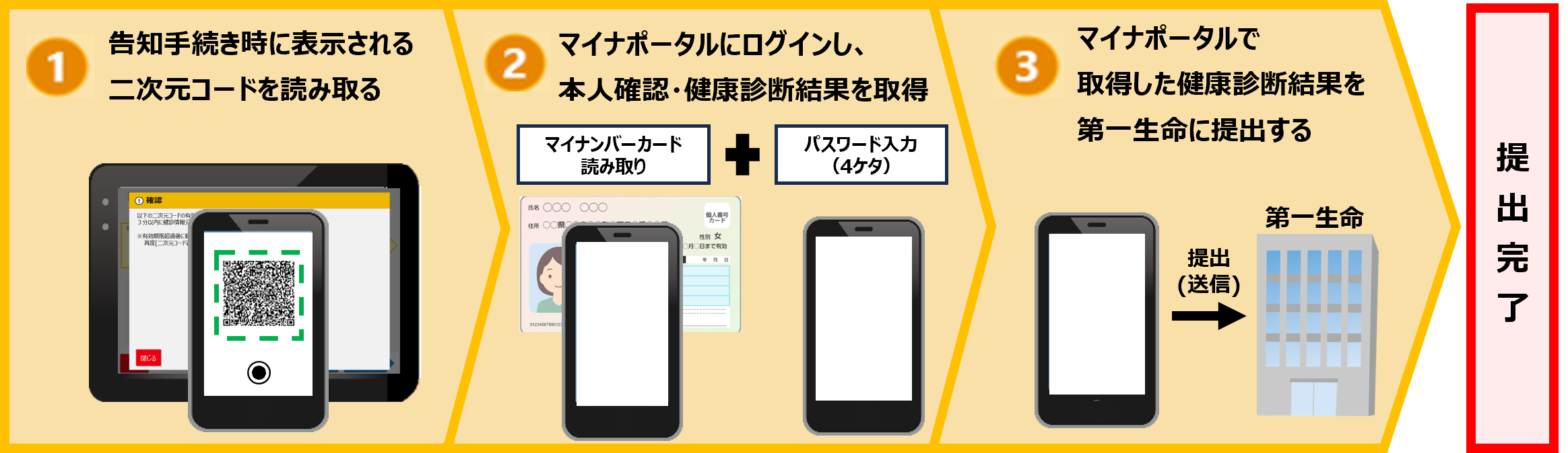 これにより、新契約加入時に提出が必要な健康診断結果について、コピーを準備いただくことや、画像を撮影して提出いただく必要はなくなり、お持ちのマイナンバーカードを利用することで、デジタル手続きによる簡単な提出が可能になります。また、健康診断結果がデータで提出されることで、当社での引受に関する審査がこれまで以上に迅速に進み、契約成立後の保険証券等もより早くお届けできるようになります。