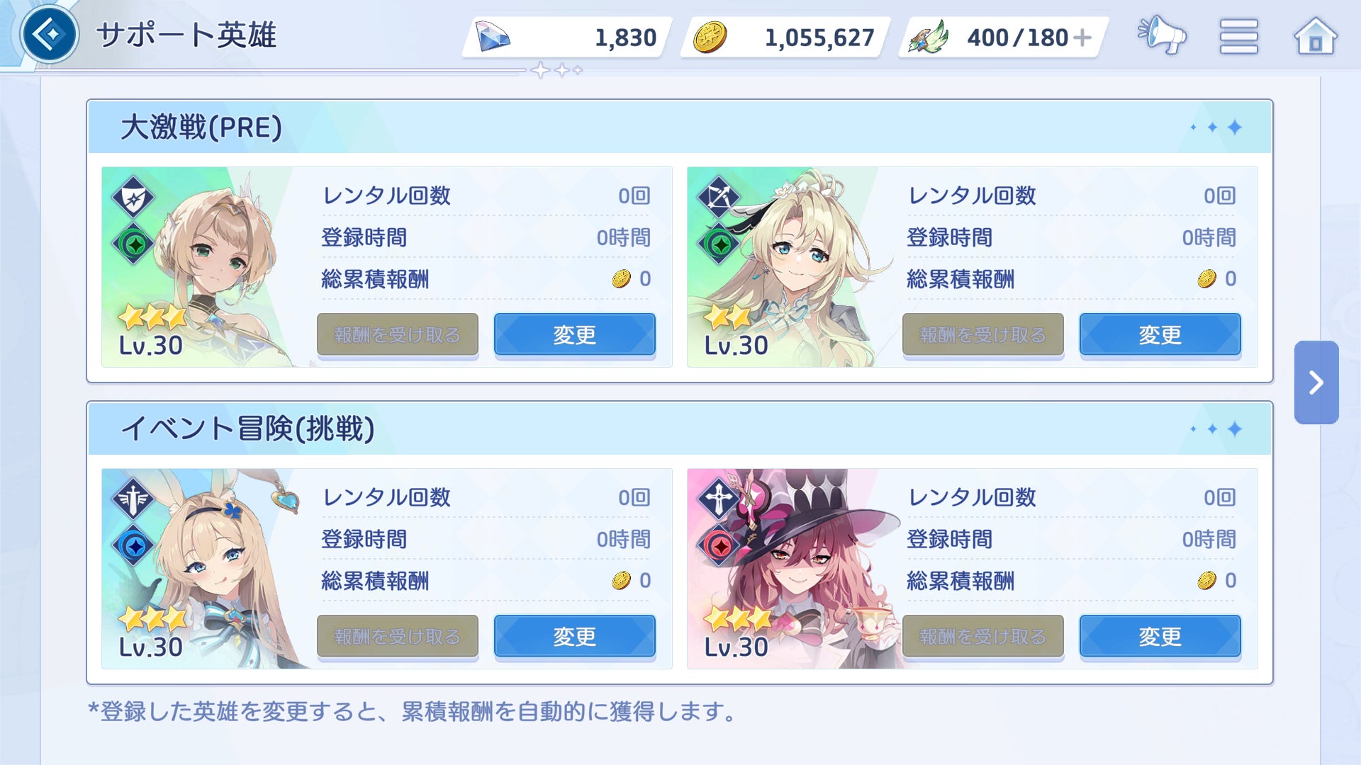 サポート英雄機能は、大激戦(PRE)、イベント冒険(挑戦)、無限録に対応しています。