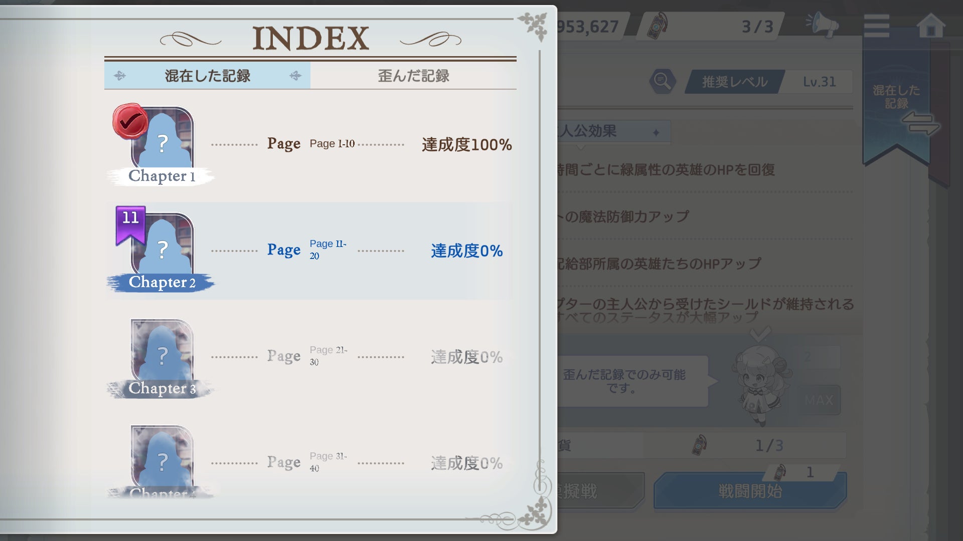 「混在した記録」を10ページクリアすると「歪んだ記録」に挑戦が可能です。「歪んだ記録」はこれまでと異なり、7種の達成ミッションが存在する挑戦バトルです。すべてのミッション達成を目指してみましょう。