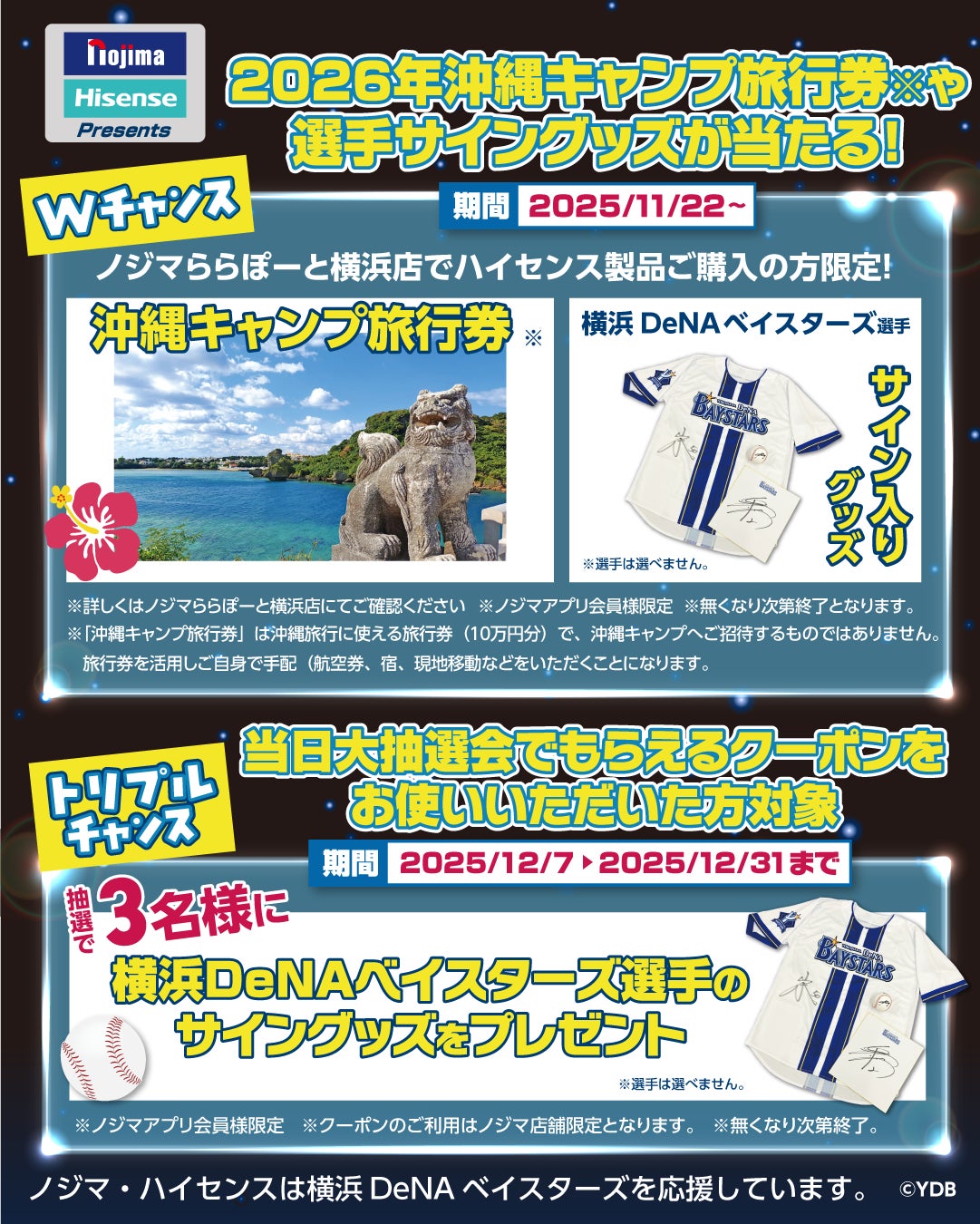 株式会社ノジマ(本社:神奈川県横浜市、代表執行役社長:野島 廣司、以下「ノジマ」)は、ハイセンスジャパン株式会社(本社:神奈川県川崎市、代表取締役社長:李 文、以下「ハイセンス」)との共同企画として、2025年12月7日(日) 13時より、ららぽーと横浜セントラルガーデンにて「ノジマ×Hisense Presents 横浜DeNAベイスターズ 選手トークショー inららぽーと横浜」を開催いたします。