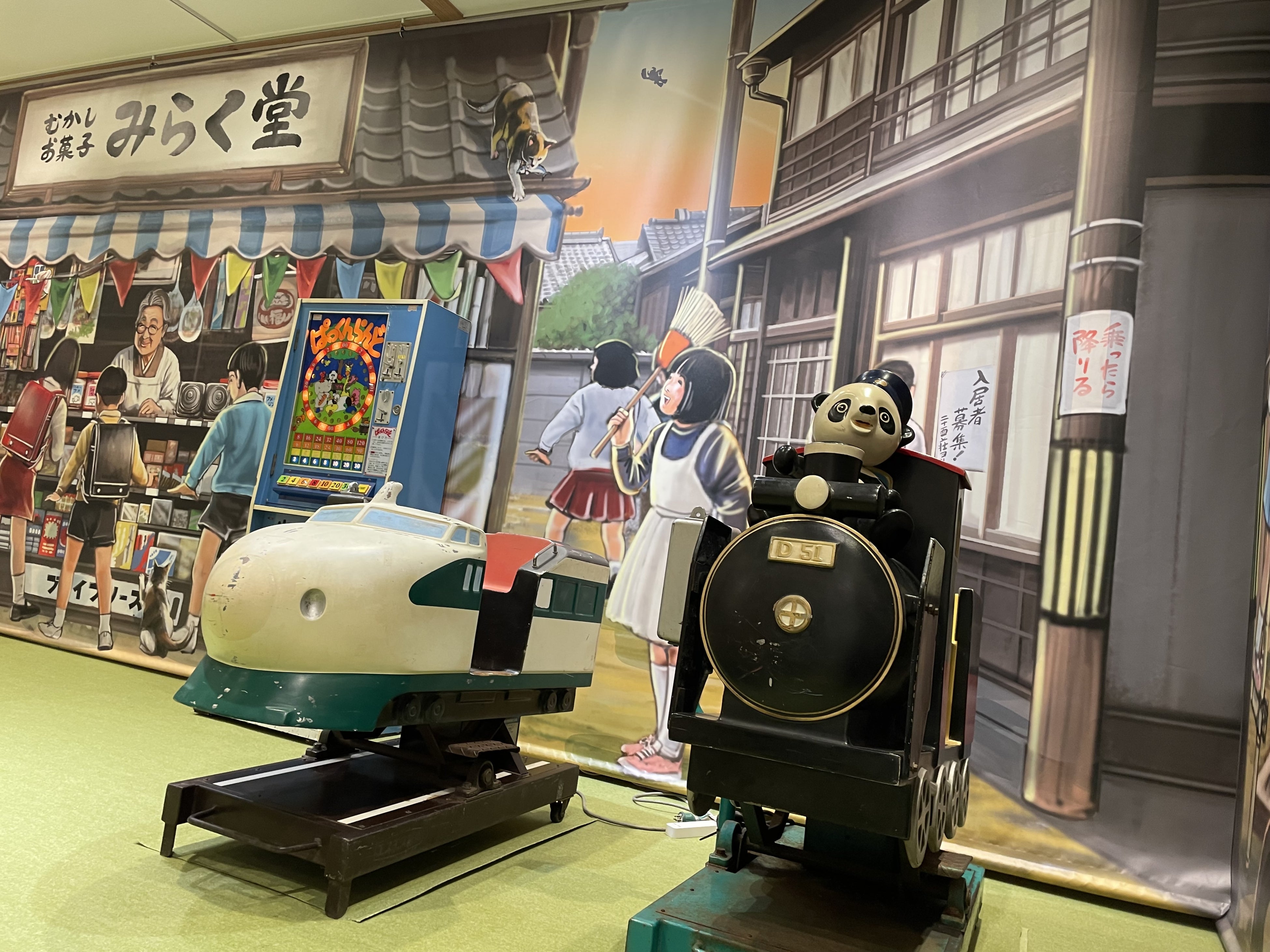 本企画展では、おもに昭和の時代に子どもたちが楽しんだ、家の中の遊びと外の遊びを紹介するとともに、実際手に取って遊べるおもちゃをご用意します。1階は、昭和の空き地や駄菓子屋をイメージした空間を再現。巨大な壁面イラストで当時の遊びの様子を演出しています。2階は昔の子ども部屋を再現。子どもの頃に使っていた家具の小ささや懐かしさを感じることができ、年代ごとのかるたやゲーム機なども展示します。