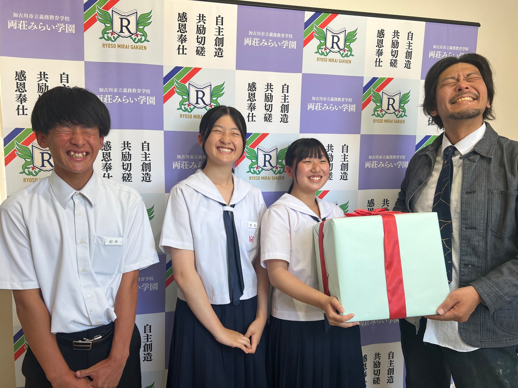 これまで両荘みらい学園では、使わなくなった教科書の寄付や募金を通して、なかよし学園の教育・食糧支援につながる活動を継続してきました。新たにバトンを受け取った3年生は、「自分たちの田んぼのお米で、世界のどこかのおなかと心を満たしたい」と考え、RYOSO米を中村代表に託すことを決めました。