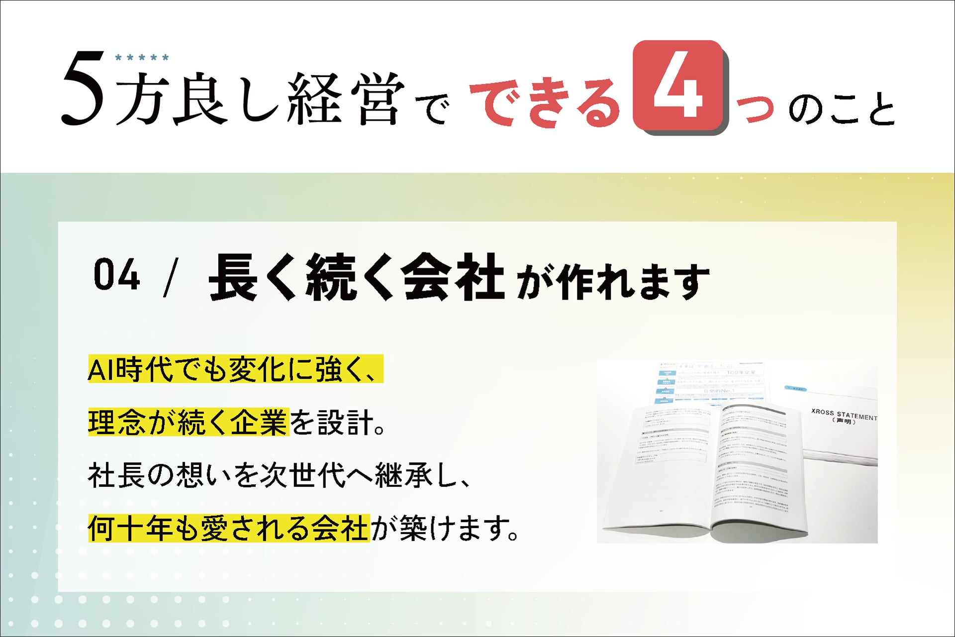 社員の納得感、顧客の信頼、社会との関係性を含めた経営判断が、長期的な企業成長を支えます。