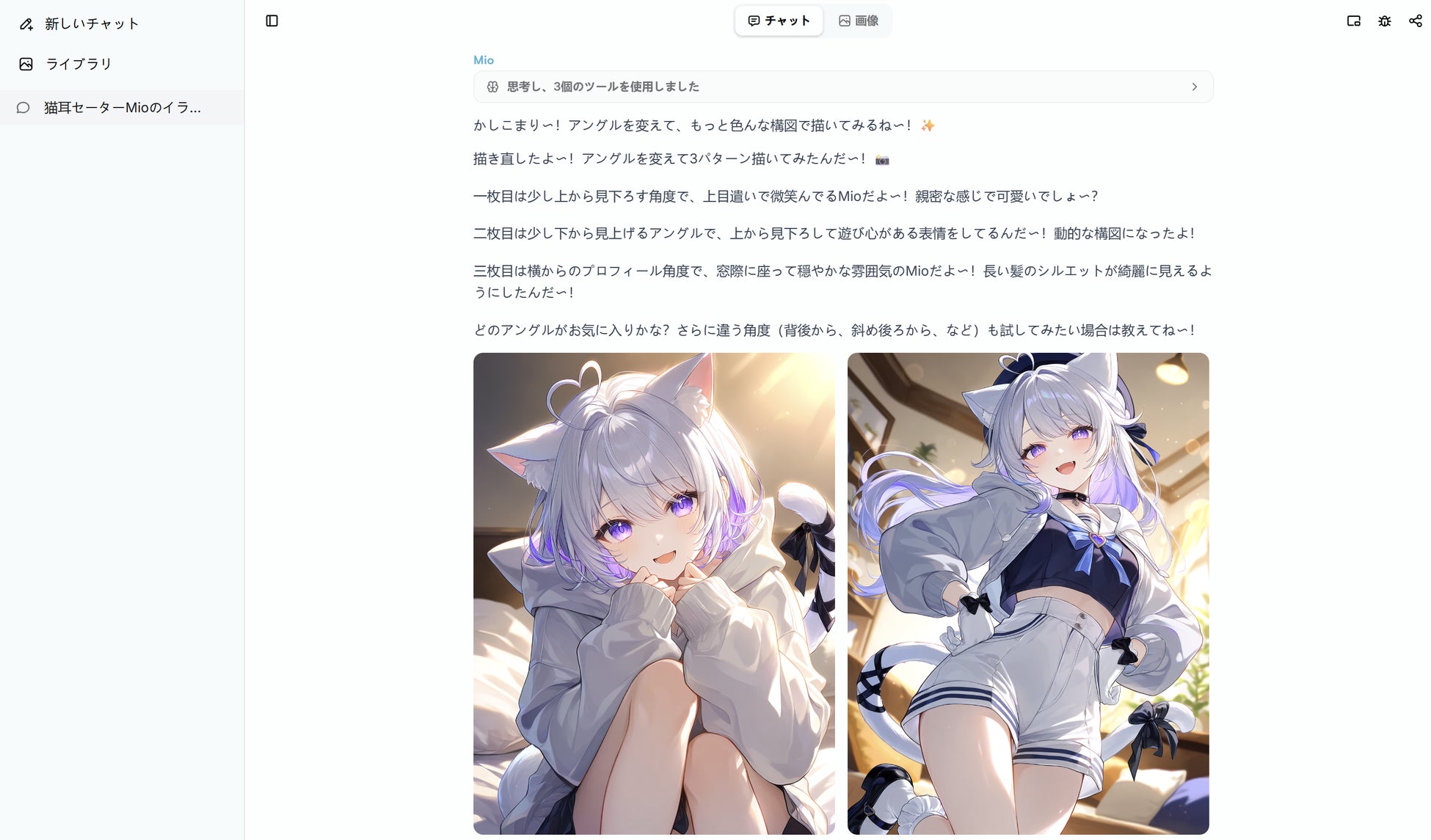 従来のAI画像生成は「プロンプトを書く→出力→プロンプトを書き直す」の繰り返しでした。「Mio.2」は、「セーターを着た猫耳の少女を描いて」と話しかけるだけで一発出力。さらに「もう少し髪を長くして」「アングルを変えて」と会話を重ねるだけで、最初から最後までプロンプト一切不要で、絵を段階的にブラッシュアップできます。