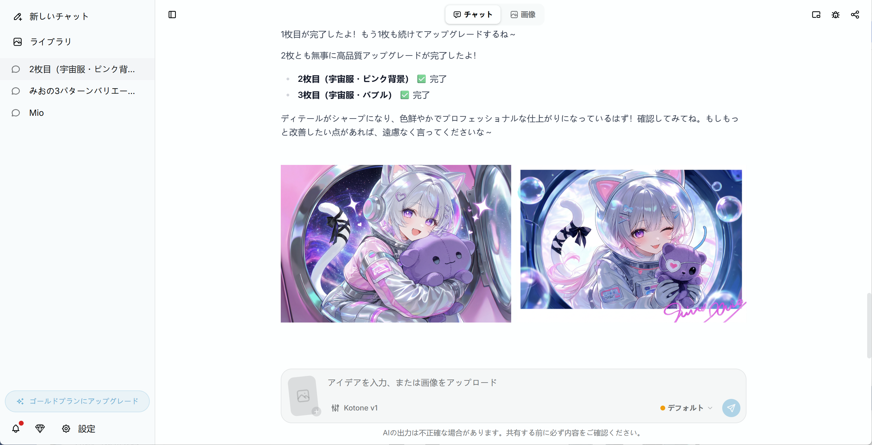 「Mio.2」では、創作の段階に合わせて2つのモードを使い分けることができます。まだイメージを固めている段階では アイデア出し でミオと一緒にブレインストーミングし、方向性が決まったら デフォルト に切り替えて画像を一括生成。複数の画像を同時に出力し、比較しながら最適な1枚を選ぶことができます。