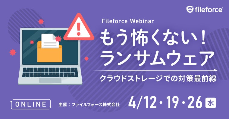 新機能リリースに合わせてファイルフォースでは、「もう怖くない!ランサムウェア クラウドストレージでの対策最前線!」と題して、猛威を振るうランサムウェア被害の実態と実際のランサムウェアのプロセスによるファイル暗号化の振る舞いから、クラウドストレージ上での検知、怪しいプロセスの排除、ピンポイント&ワンクリックのファイル復旧をデモンストレーションでご紹介をするWebセミナーを3月より好評開催しています。