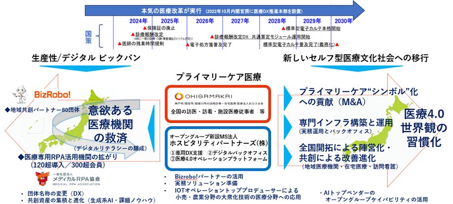 RPAソリューションや生成系AIを起点として、日本全国の地域や業界において拍車がかかる人手不足と、デジタル格差による現場生産性の問題解決を支援・実現してきたオープングループ株式会社(本社:東京都港区、代表取締役:高橋 知道、以下「当社」)は、2024年9月11日(水)にリリースした「共創開拓プロジェクト」第一弾となる医療業界における取り組み「医療4.0プラットフォーム構想」※において、プライマリーケア時代におけるミドルバックオペレーションの完全自動化とシェアードサービスのインフラ構築を掲げていることを発表いたしました。
