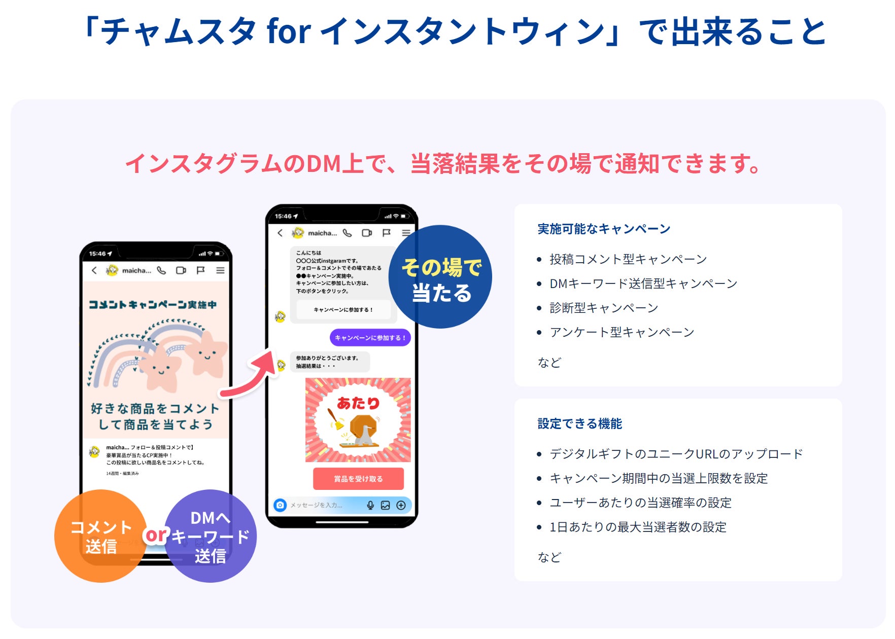 「チャムスタ for インスタントウィン」は、従来Instagramで難しかった、その場で結果が分かるインスタントウィン型のCPが実施できるツールです。