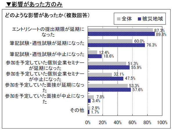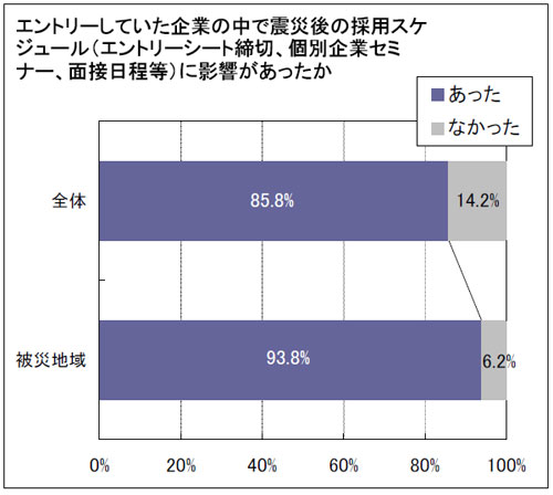 エントリーしていた企業の中で震災後の採用スケジュールに影響があったかを学生に聞いたところ、全体で85.8%が「あった」と回答した。さらに、被災地域の学生においては93.8%が「あった」と回答している。影響が「あった」と回答した学生に、どのような影響があったか聞くと、「エントリーシートの提出期限が延期になった」と回答した割合が最も多く、筆記試験・適性検査や個別企業セミナー、面接等、就職活動の各フェーズにおいても「延期」になるケースが多く見られた。