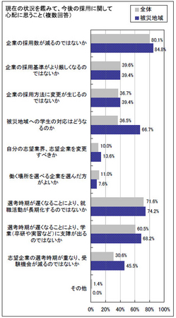震災の影響を受け、今後の採用に関しての心配事も多数挙げられた。全体では、「企業の採用数が減るのではないか」と回答した学生が80.1%、「選考時期が遅くなることにより、就職活動が長期化するのではないか」が71.6%、「選考時期が遅くなることにより、学業(卒研や実習など)に支障が出るのではないか」が60.5%と上位を占めた。しかし、被災地域ではそれらに加え「被災地域への学生の対応はどうなるのか」が66.7%(全体36.5%)、「志望企業の選考時期が重なり、受験機会が減るのではないか」が45.5%(全体30.6%)となり、今後の採用に関する不安は被災地域以外の学生よりも多岐に渡っている。