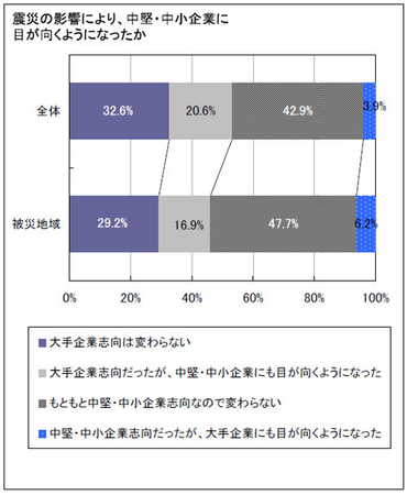震災の影響により志望企業、志望業種に変化があったかを聞いたところ、全体で12.4%、被災地域で16.9%の学生が「あった」と回答した。また、中堅・中小企業に目が向くようになったかという問いに対して、全体では「もともと中堅・中小企業志向なので変わらない」とした割合が42.9%となったが、「大手企業志向だったが、中堅・中小企業にも目が向くようになった」とした割合が20.6%と5人に1人いることがわかった。「もともと中堅・中小企業志向なので変わらない」+「大手企業志向だったが、中堅・中小企業にも目が向くようになった」は全体で63.5%となり、中堅・中小企業を視野に入れる学生が増加する結果となった。