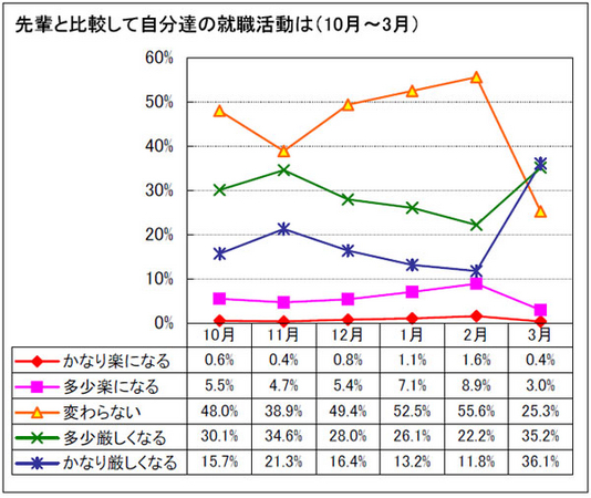 先輩と比較して自分達の就職活動がどうなるか聞いたところ、「多少厳しくなる」+「かなり厳しくなる」と回答した学生の割合が急増した。全体の71.3%が厳しくなると回答しており、前月34.0%から2倍以上増加している。震災の影響により採用人数削減の危惧や採用スケジュールの不透明感に対する不安など、採用環境の著しい変化に学生の大きな戸惑いが見られる結果となった。