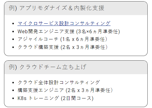フェーズの組合せ(コンサル、構築、運用)、契約形態の組合せ (準委任、サービス)も可能です。ご支援が必要なエリアに対してサービス提供をしてまいります。