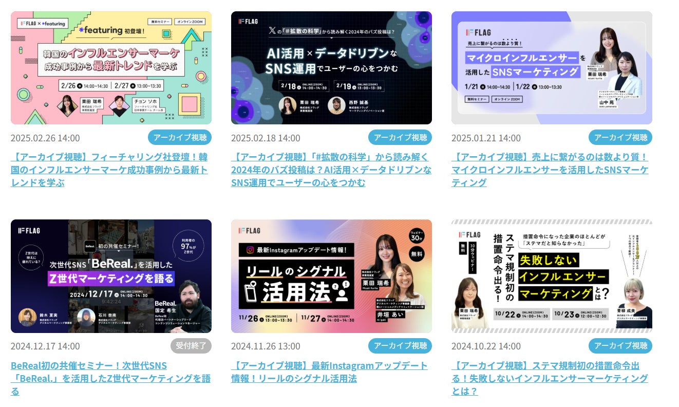 マーケティングコミュニケーションの総合プロデュースを担う株式会社フラッグ(本社:東京都渋谷区、代表取締役:久保浩章、以下、当社)は2025年4月15日(火)、16日(水)に、インフルエンサーマーケティングの活用を検討している事業主・広告代理店様などを対象として、SNSごとの特徴や活用方法をお伝えする無料ウェビナーを開催いたします。