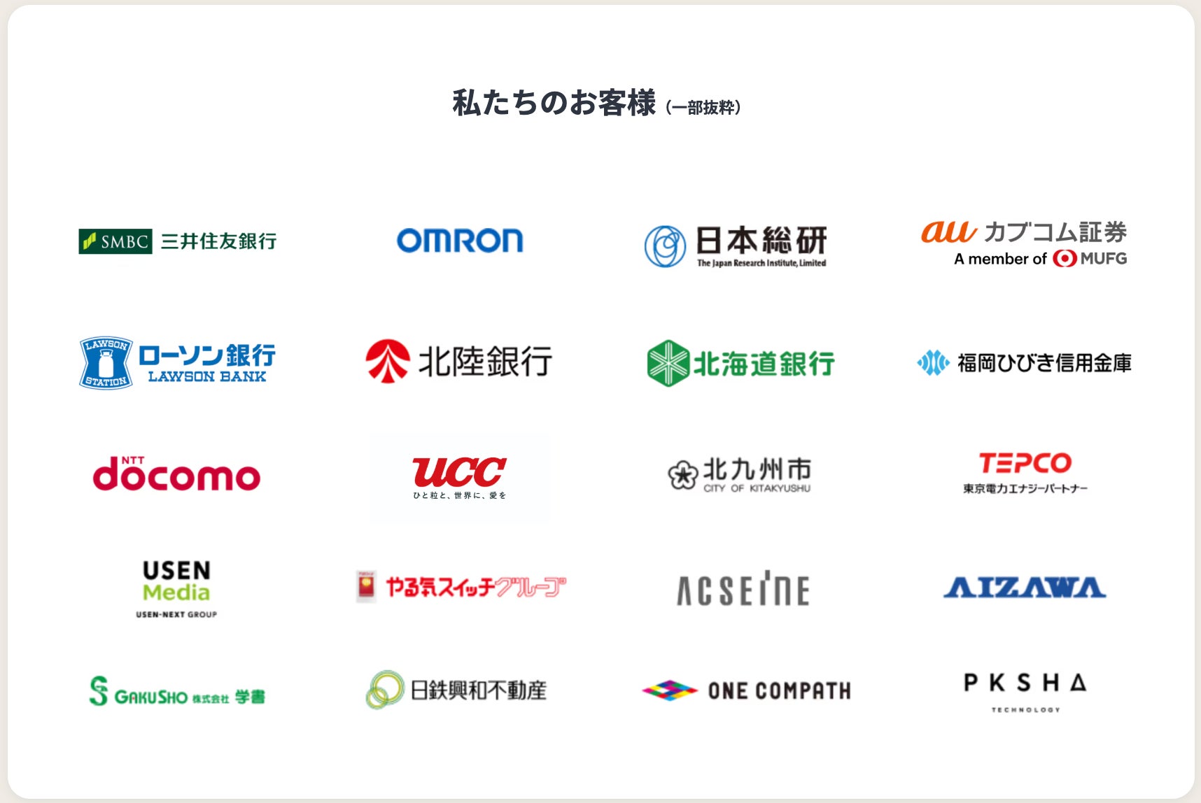 アジケは金融機関・銀行を中心に製造、通信など幅広い業界のお客様の、サービス設計、UI/UXデザイン、新規事業開発など様々なプロジェクトを支援しています。