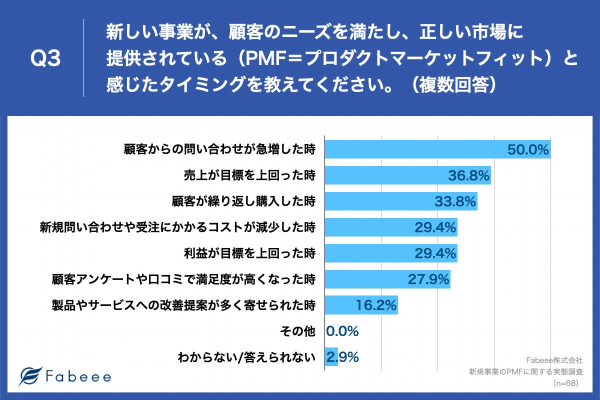 Q2で「非常にそう思う」「ややそう思う」と回答した方に、「Q3.新しい事業が、顧客のニーズを満たし、正しい市場に提供されている(PMF=プロダクトマーケットフィット)と感じたタイミングを教えてください。(複数回答)」(n=68)と質問したところ、「顧客からの問い合わせが急増した時」が50.0%、「売上が目標を上回った時」が36.8%、「顧客が繰り返し購入した時」が33.8%という回答となりました。