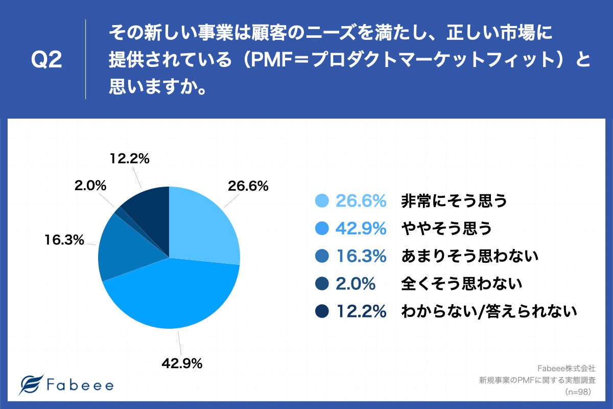 「Q2.その新しい事業は顧客のニーズを満たし、正しい市場に提供されている(PMF=プロダクトマーケットフィット)と思いますか。」(n=98)と質問したところ、「非常にそう思う」が26.6%、「ややそう思う」が42.9%という回答となりました。