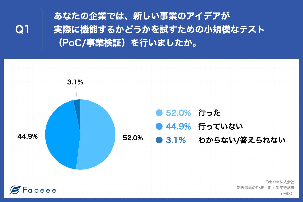 「Q1.あなたの企業では、新しい事業のアイデアが実際に機能するかどうかを試すための小規模なテスト(PoC/事業検証)を行いましたか。」(n=98)と質問したところ、「行った」が52.0%、「行っていない」が44.9%という回答となりました。