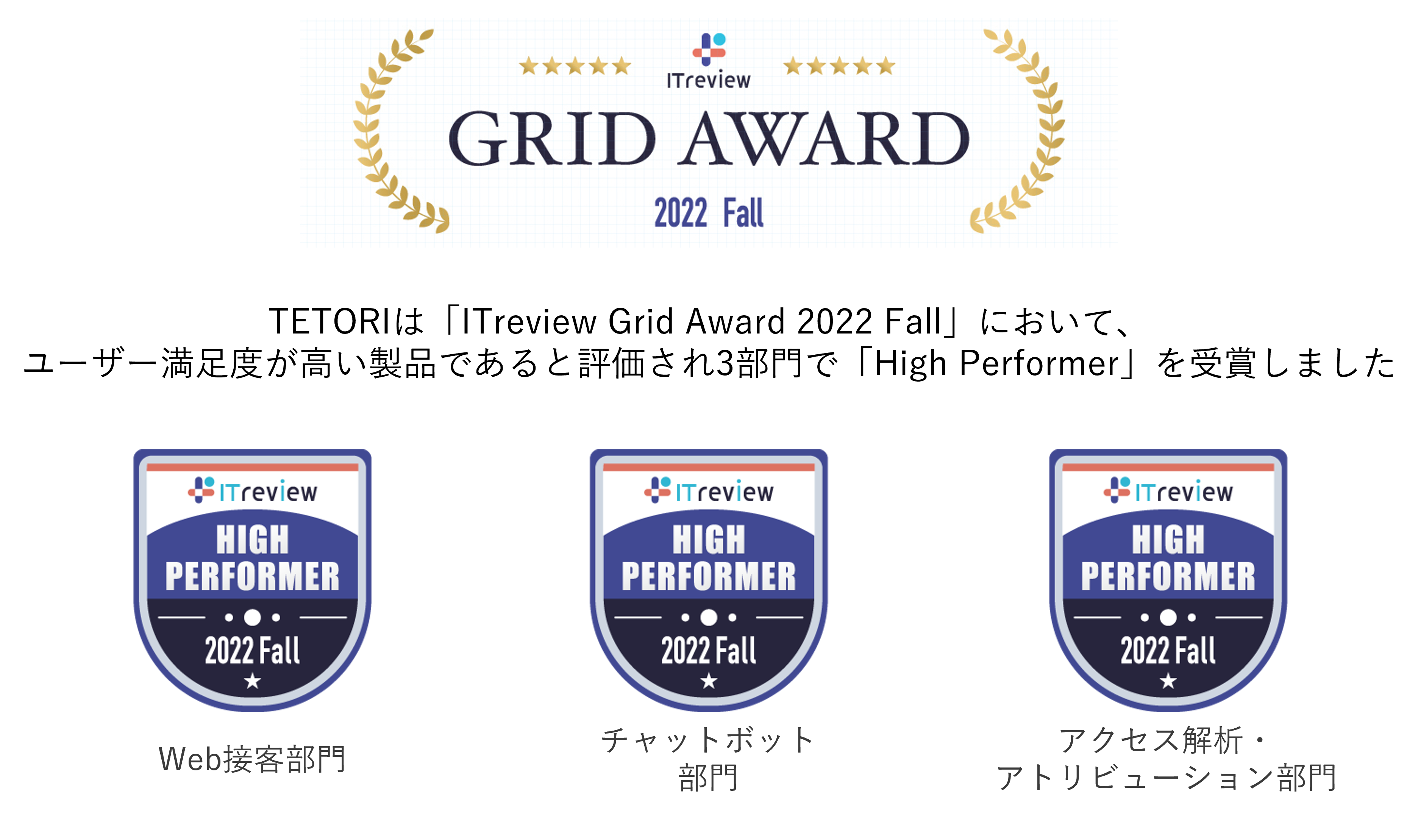 Web接客ツール「TETORI(テトリ)」は、「ITreview Grid Award 2022 Fall」の「Web接客部門」「チャットボット部門」「アクセス解析・アトリビューション部門」の3部門において、ユーザーからの満足度が高い製品である、また今後の注目の製品であると評価され「High Performer」の称号を受賞いたしました。今後もさらにお客様の満足度向上を目指してサービス開発に邁進してまいります。