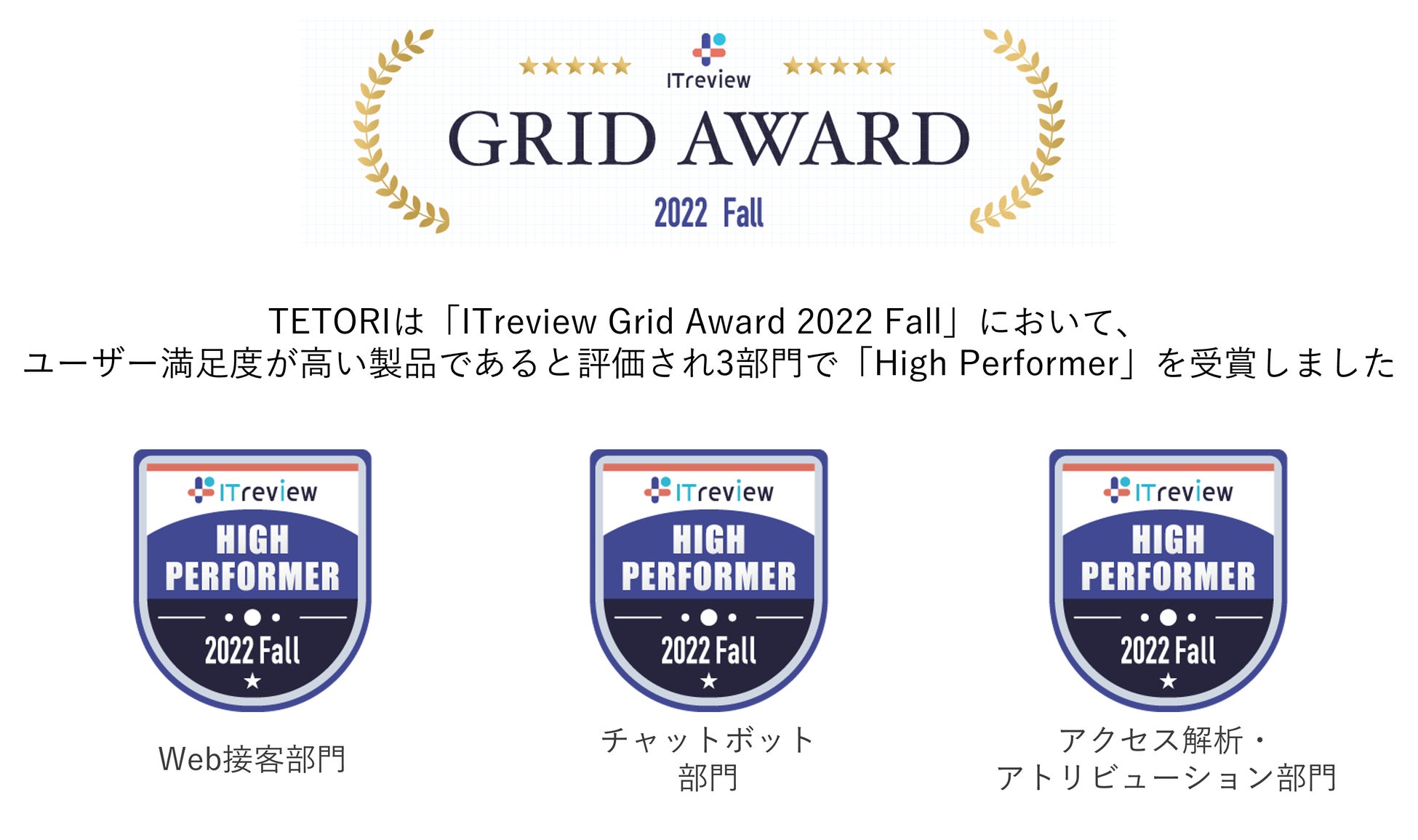 Web接客ツール「TETORI(テトリ)」が「ITreview Grid Award 2022 Fall」3部門で、高いユーザー満足度が評価され「High Performer」を受賞