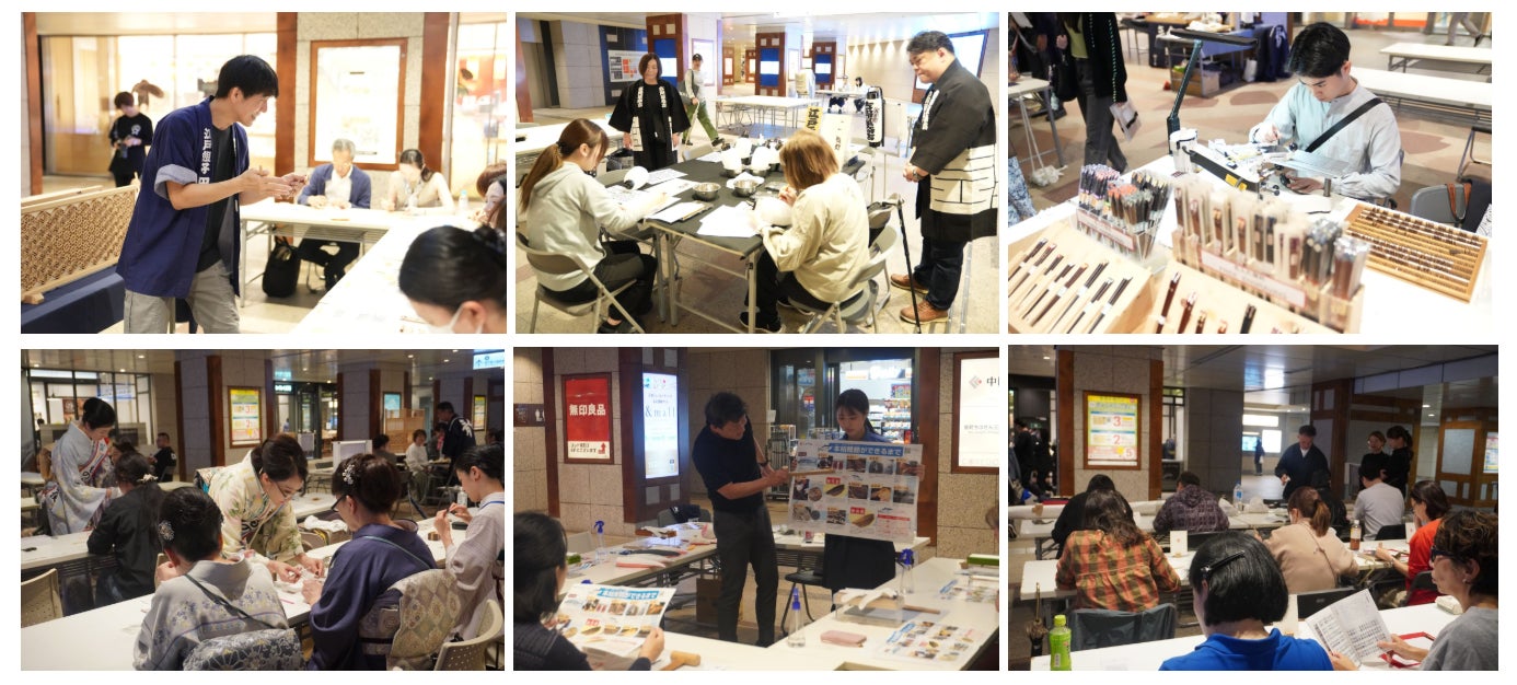 江戸桜通り地下歩道を会場としたワークショップは、7つのブースで江戸組紐や組子コースターづくり、手書き提灯の制作など、その場で制作を体験できる講座が人気を集めました。