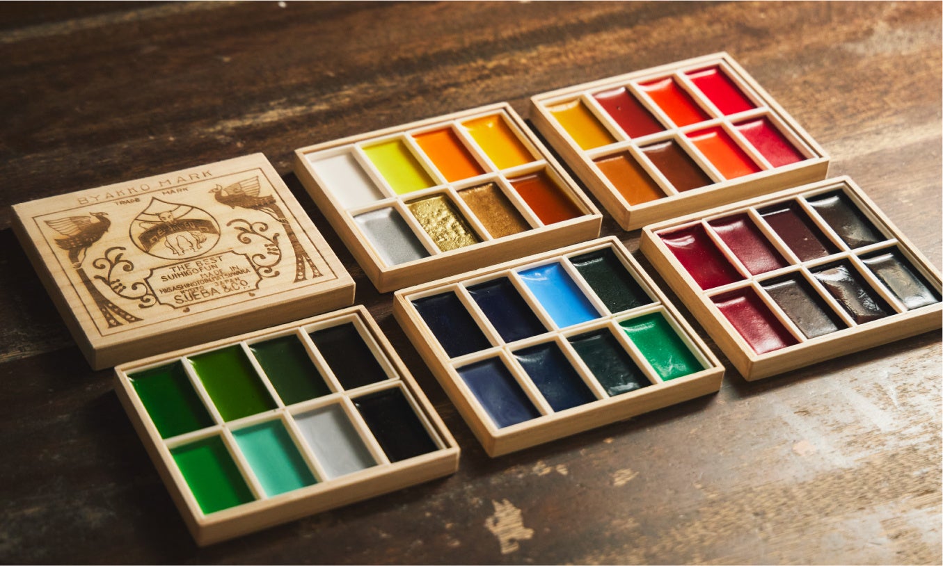 1751年(宝暦元年)、京都の東洞院松原上ルにおいて初代ゑのぐや惣兵衛が創業。白狐印でみなさまに愛される日本最古の日本画用絵具専門店として、岩絵具、水干絵具など700点もの画材商品を卸販売しています。2010年(平成22年)に新しい試みとして胡粉ネイルを開発しました。