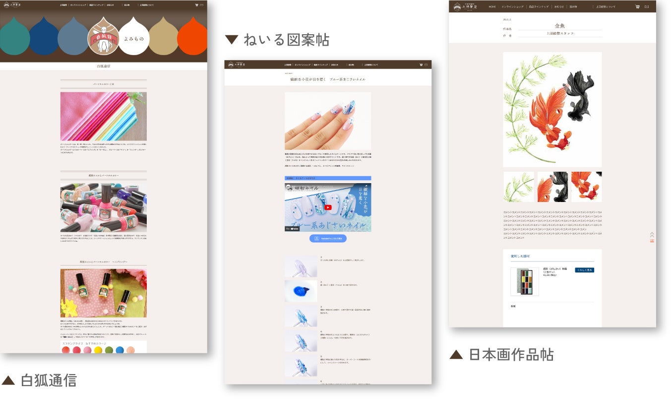 ●「白狐通信」(読み物)や「ねいる図案帖」(ネイルアレンジ紹介)、「日本画作品帖」(上羽絵惣の絵具を使用した作品集)などお楽しみコンテンツも充実。今後の更新も予定しています。