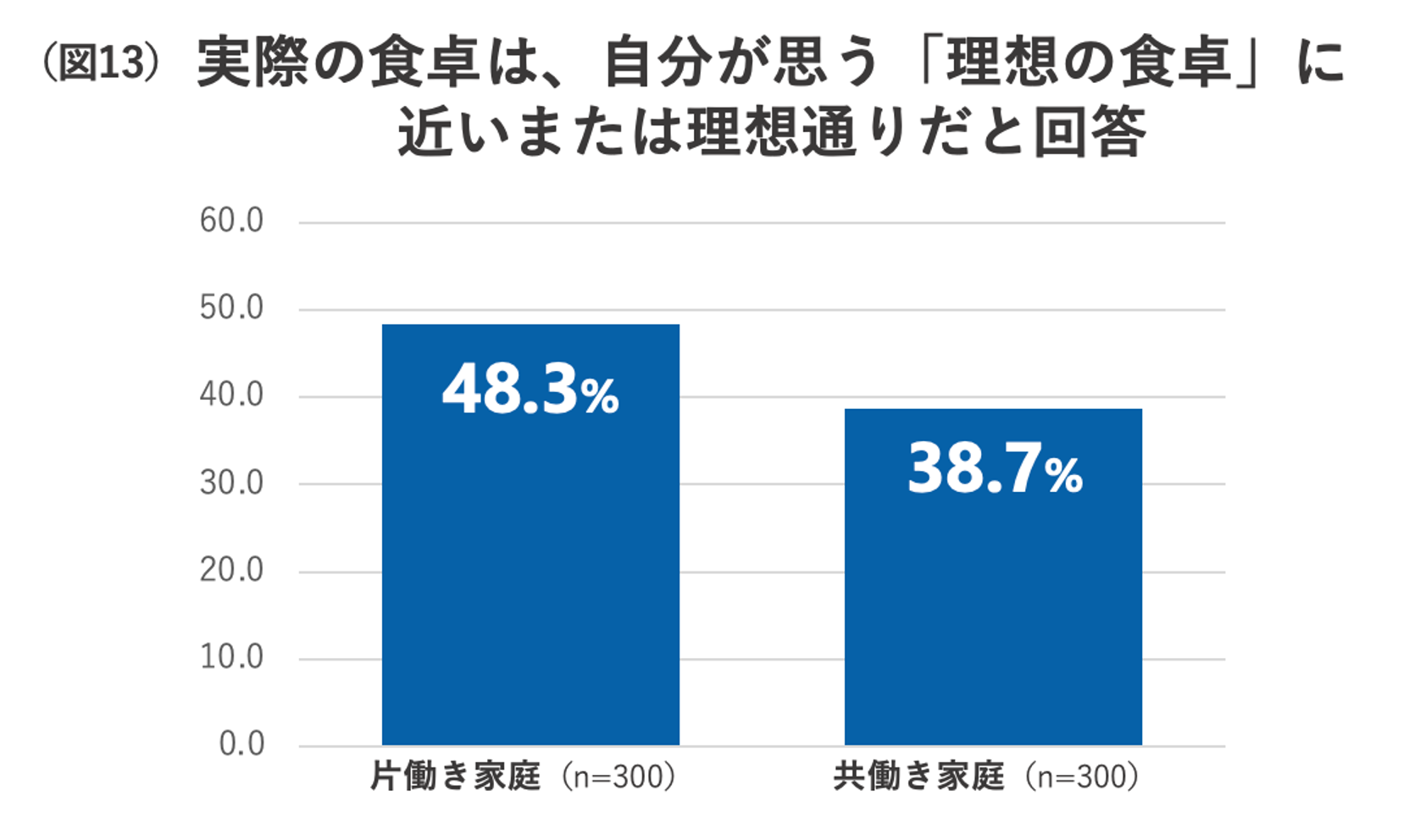 そして、片働き家庭(n=300)と共働き家庭(n=300)を比較したところ、「理想通りの食卓」または「理想に近い」と回答した人は、共働き家庭のほうが9.7%低い結果になりました。さらに、年代別にみると、30代全体(n=91)で「理想通りの食卓」または「理想に近い」と回答した人は28.6%と他年代と比較して低く、理想の食卓と感じている人が少ないことが明らかになりました。(図13)