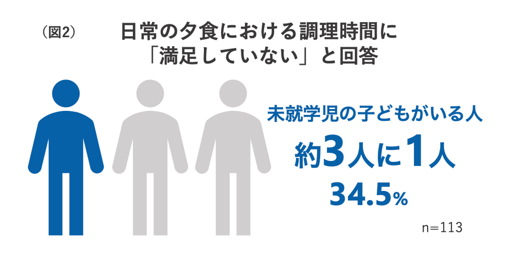 また、未就学児の子どもがいる人(n=113)に「日常の夕食における調理時間に対する満足度」を尋ねたところ、約3人に1人(34.5%)が現状の調理時間に満足していないことが明らかになりました。(図2)
