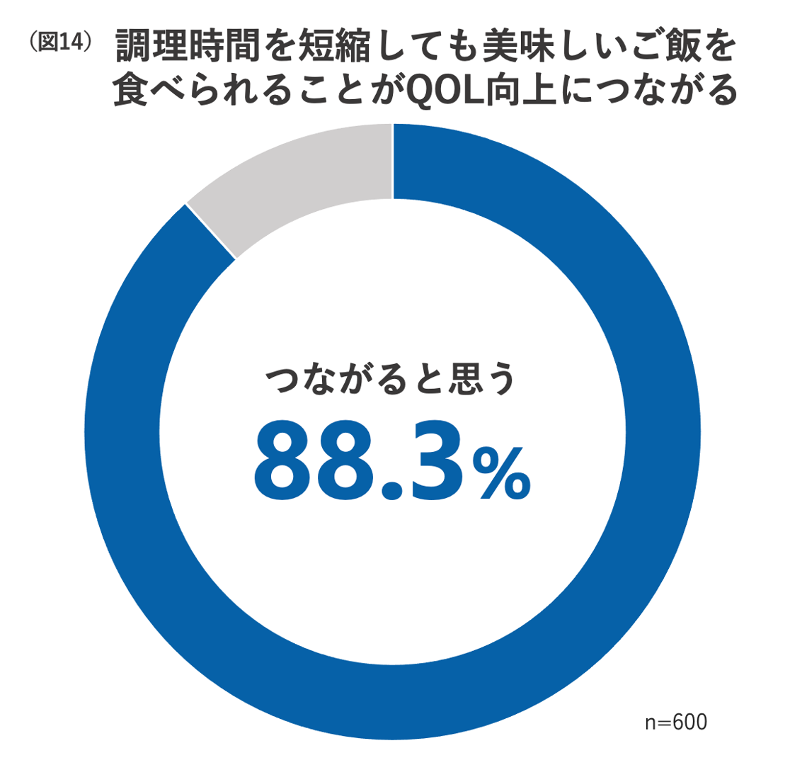全体(n=600)に「調理時間を短縮しても美味しいご飯を食べられることがQOL向上につながるかどうか」を尋ねたところ、88.3%の人が「調理時間の短縮がQOL向上につながる」と考えていることが判明しました。(図14)