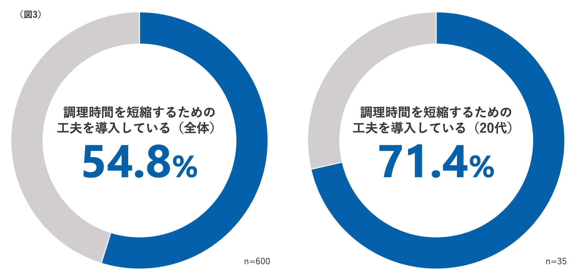 全体(n=600)に「調理時間を短縮するための工夫を導入しているか」尋ねたところ、「導入している」と回答した人は54.8%に。中でも20代は71.4%が「工夫を取り入れている」と回答し、年代別では最も多い結果になりました。(図3)