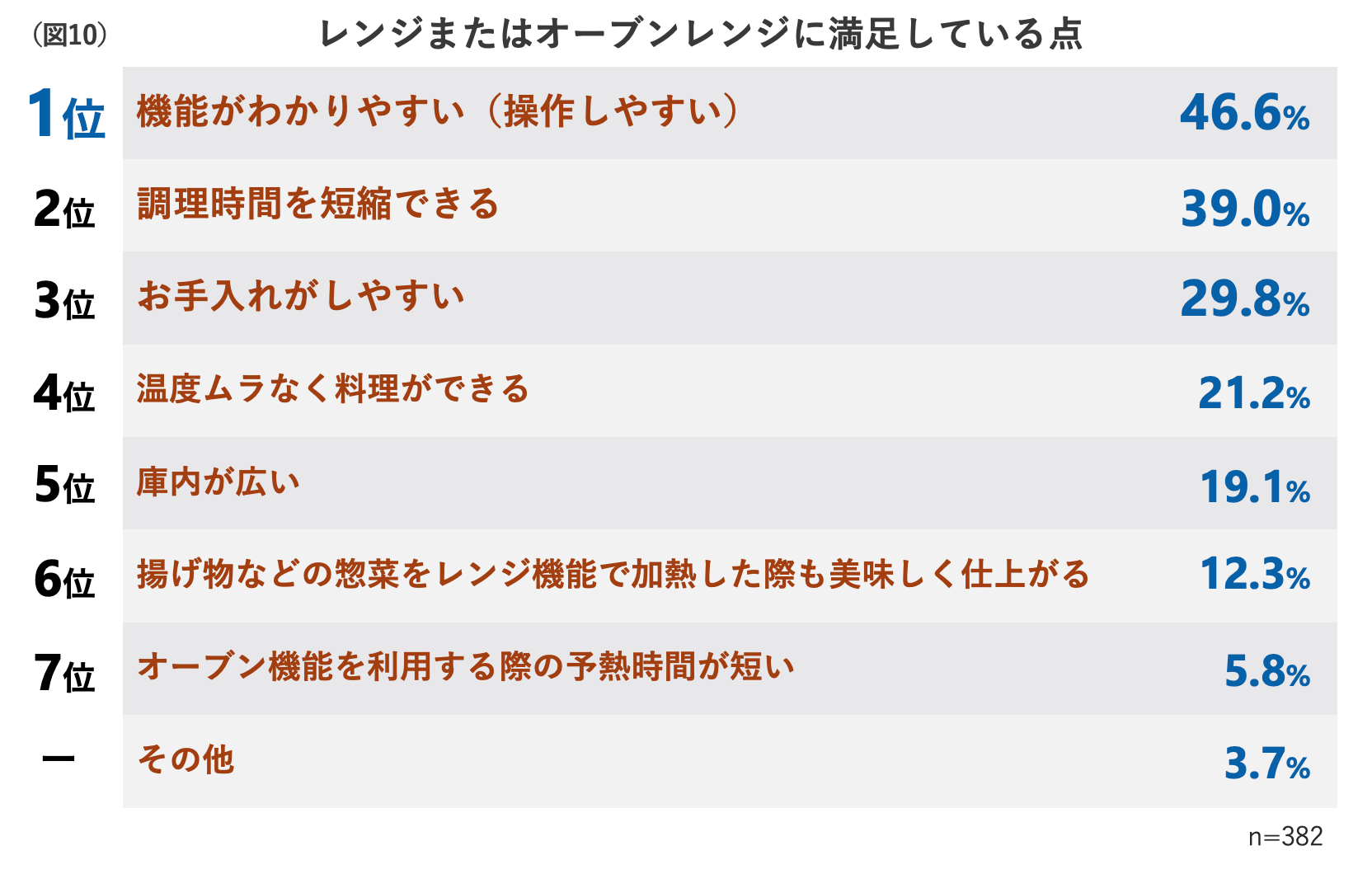 その他「温まりが悪く、温度ムラもあるため、向き変えて複数回温めないといけない(30代女性)」「自動機能の温めで熱くなりすぎる(40代女性)」などの不満もありました。満足している人(n=382)に「レンジまたはオーブンレンジに対する満足内容」を尋ねたところ、1位「機能がわかりやすい(操作しやすい)」、2位「調理時間を短縮できる」、3位「お手入れがしやすい」という結果になりました。(図10)