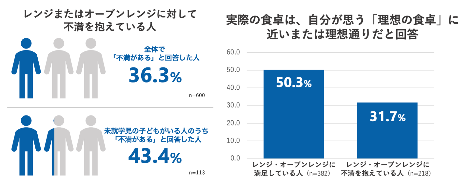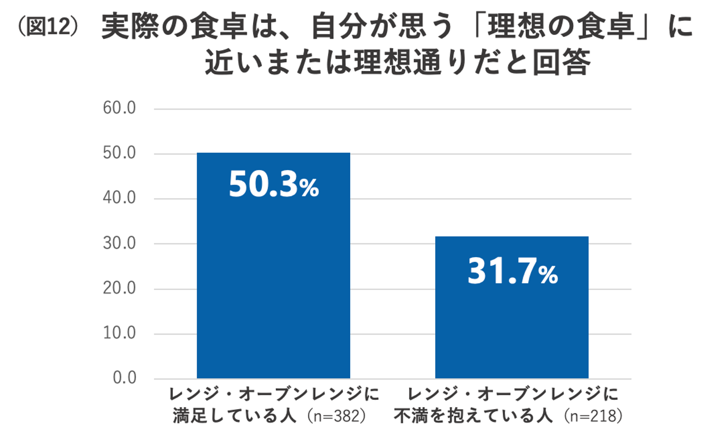 多くの人が「調理時間を短縮することがQOLの向上に繋がる」と回答していることに加え、レンジやオーブンレンジに満足している層のほうが「理想の食卓に近い」と回答した人が多いことから、レンジやオーブンレンジの不満の解消や調理時間の短縮がQOL向上や理想の食卓に繋がるのかもしれません。