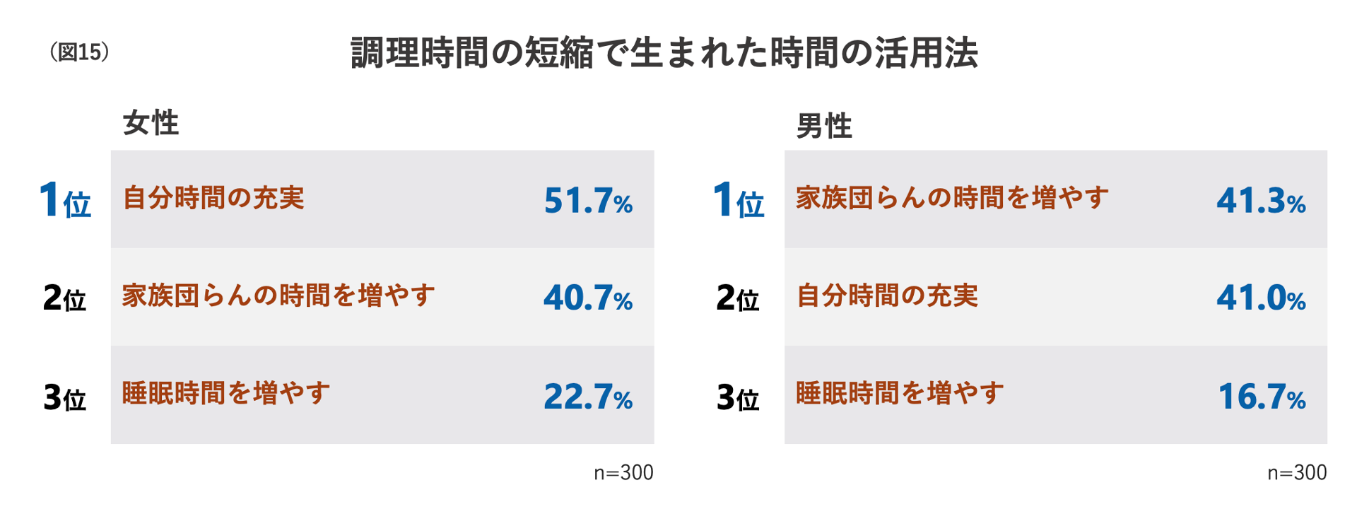 また、「調理時間の短縮で生まれた時間の活用法」を尋ねたところ、女性(n=300)の1位は「自分時間の充実」であったのに対し、男性(n=300)の1位は「家族団らんの時間を増やす」という結果になり、男女間での意識の差が明らかになりました。(図15)