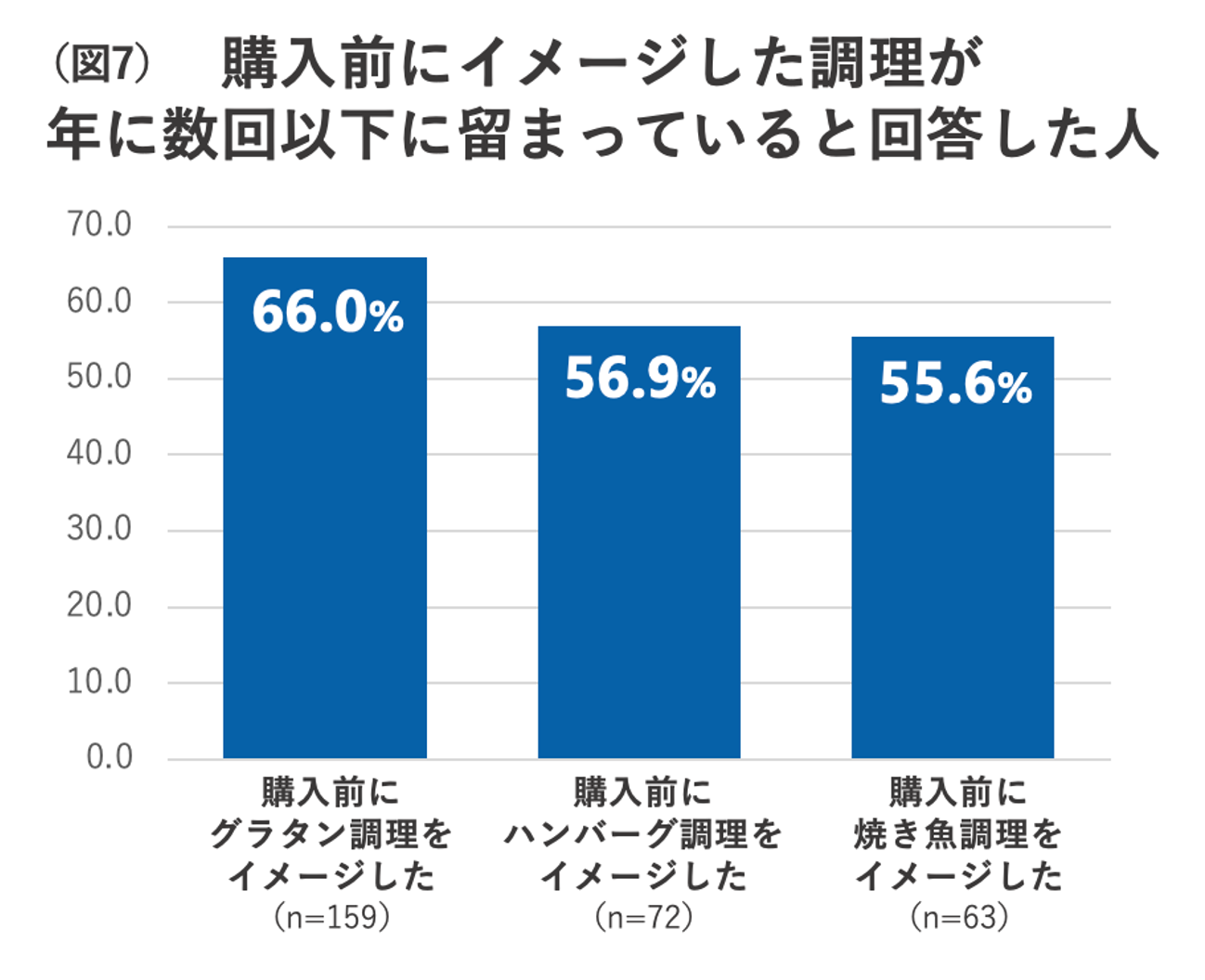 グリル機能を最も利用していない人(n=155)に理由を尋ねると、「時間がかかる」「片付けが面倒」などの意見が見受けられました。また、購入前にグリル機能を使ったグラタン調理をイメージした人(n=159)のうち、66.0%が実際に調理する頻度は「年に数回以下」に留まっていることが判明。グリル機能でハンバーグ調理をイメージした人(n=72)は56.9%、焼き魚調理をイメージした人(n=63)は55.6%とどちらも半数以上が「年に数回以下」となっており、実際にはあまり活用できていない実態が明らかになりました。(図7)