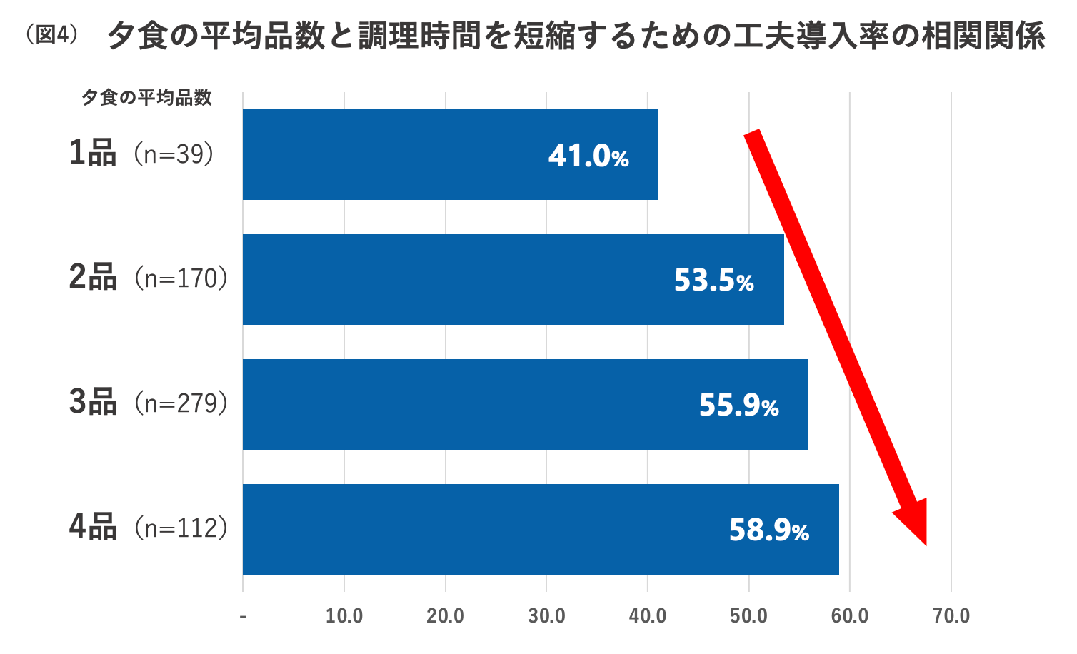 さらに、夕食の平均品数別にみると、品数が多い人ほど工夫を取り入れている割合が高く、効率的に料理をしている様子が伺えました。(図4)