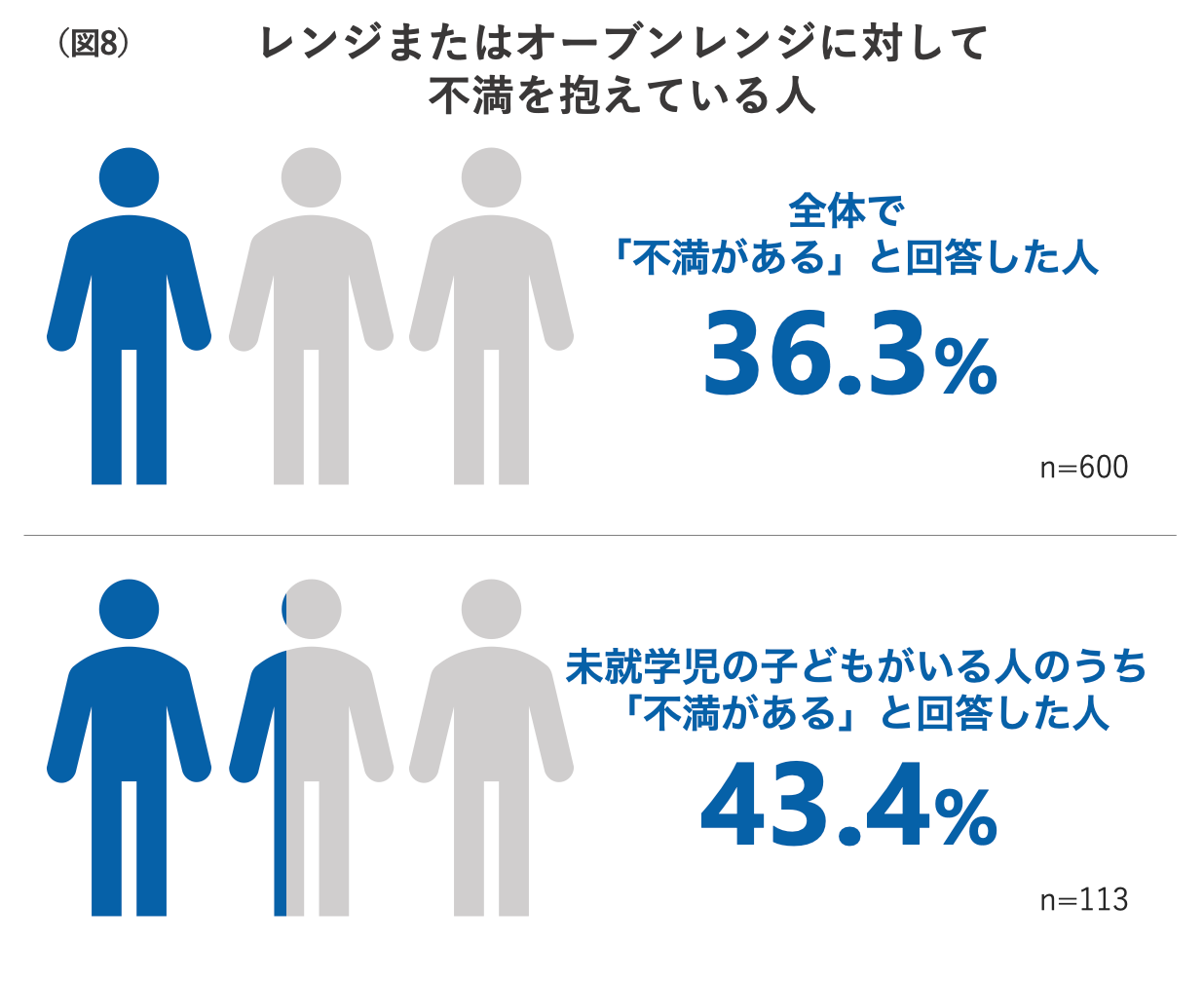 全体(n=600)に「レンジまたはオーブンレンジに対しての不満」を尋ねたところ、約3人に1人(36.3%)が不満を抱えていることが明らかになりました。中でも未就学児の子どもがいる人(n=113)は、43.4%が「不満がある」と回答しており、不満を抱えている人が多い傾向が明らかになりました。(図8)