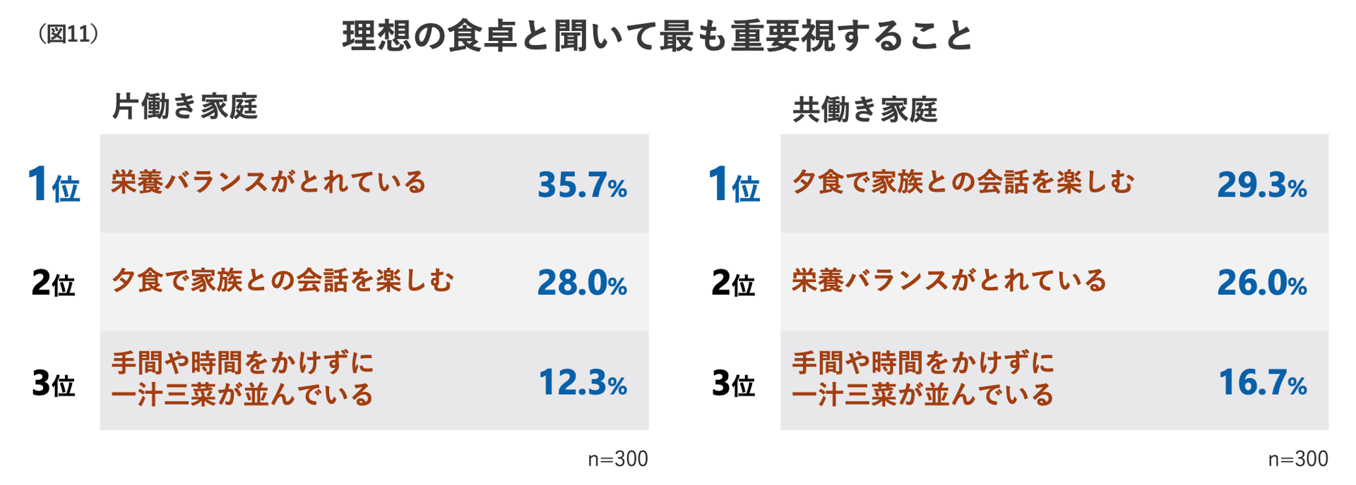 全体(n=600)に「理想の食卓と聞いて最も重要視すること」を尋ねたところ、1位「栄養バランスがとれている」(30.8%)、2位「夕食で家族との会話を楽しむ」(28.7%)が続き、“栄養バランス”と“家族との会話”が理想の食卓に欠かせないことのツートップであることが判明しました。さらに、家庭タイプ別にみると、片働き家庭は「栄養バランスがとれている」が35.7%で1位、共働き家庭では「夕食で家族との会話を楽しむ」が29.3%で1位となりました。(図11)