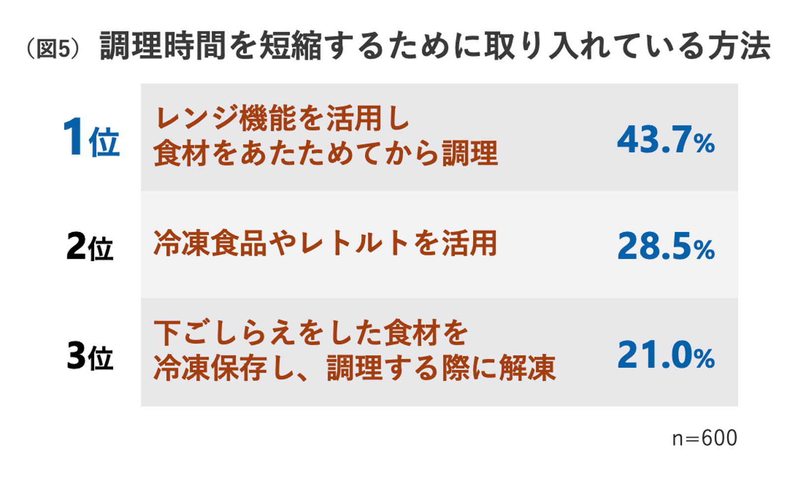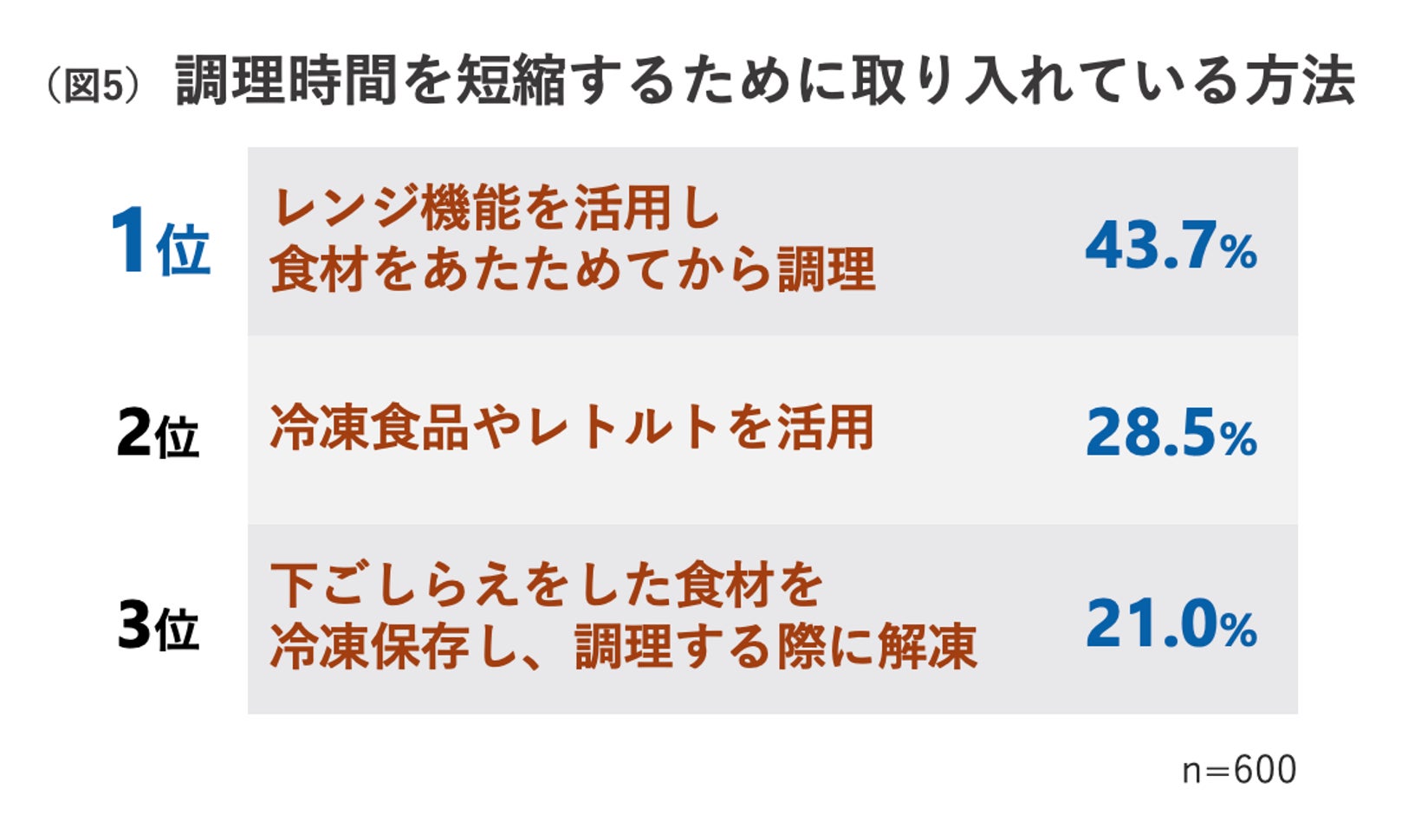 その他の工夫としては「電子レンジを活用して火を通す(50代女性)」といったお手軽な方法や、「パスタを水に浸して茹でる時間を短縮(50代男性)」「里芋や小松菜等は軽く茹でてから冷凍保存する(60代男性)」といった熟練の技なども見受けられました。
