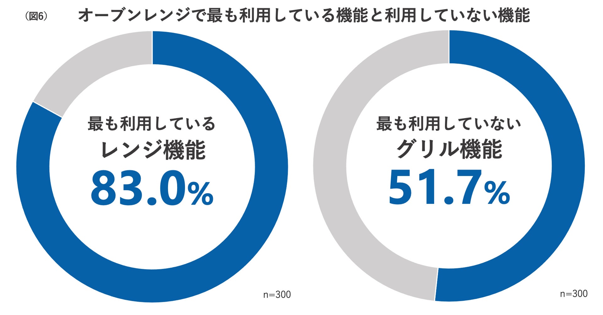 オーブンレンジ所有者(n=300)に「オーブンレンジで最も利用している機能」を尋ねたところ、83.0%が「レンジ機能」と回答しています。一方で、「最も利用していない機能」は、半数以上(51.7%)が「グリル機能」と回答しました。(図6)