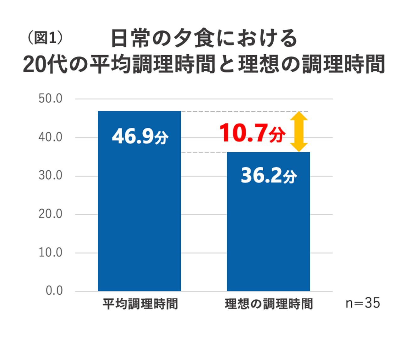 全体(n=600)に「日常の夕食における調理時間と品数」を尋ねたところ、平均調理時間は41.1分、平均品数は2.80品でした。中でも、20代の平均調理時間は46.9分と他年代と比較して長いことが明らかになりました。さらに、理想の調理時間を尋ねたところ、20代では平均36.2分となり、実際の調理時間との差は10分以上と大きな差が出る結果となりました。(図1)