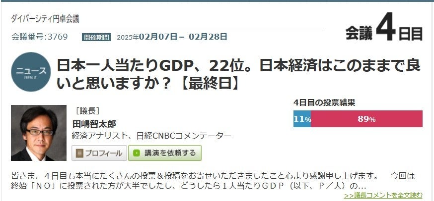 3769テーマ目となったのは、「日本一人当たりGDP、22位。日本経済はこのままで良いと思いますか?」。議長に経済アナリスト、日経CNBCコメンテーターとして活躍する田嶋智太郎氏を迎え、2025年2月7日(金)から28日(金)まで、4回にわたり議論を行いました。