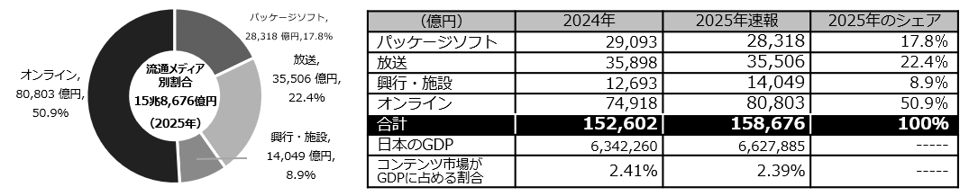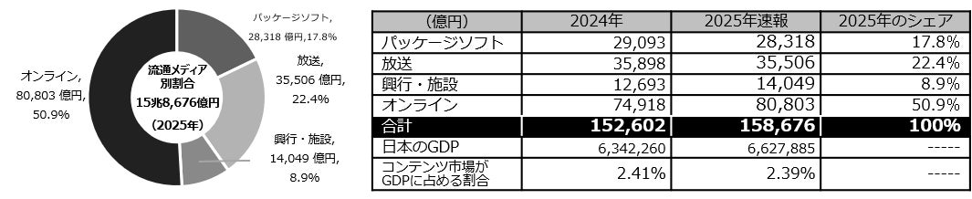 2025年の日本の国内コンテンツ市場の各分野発表・推計値の合計は、前年から4%増の15兆8,676億円。オンラインのコンテンツ・広告の合計が市場の過半を超えた。