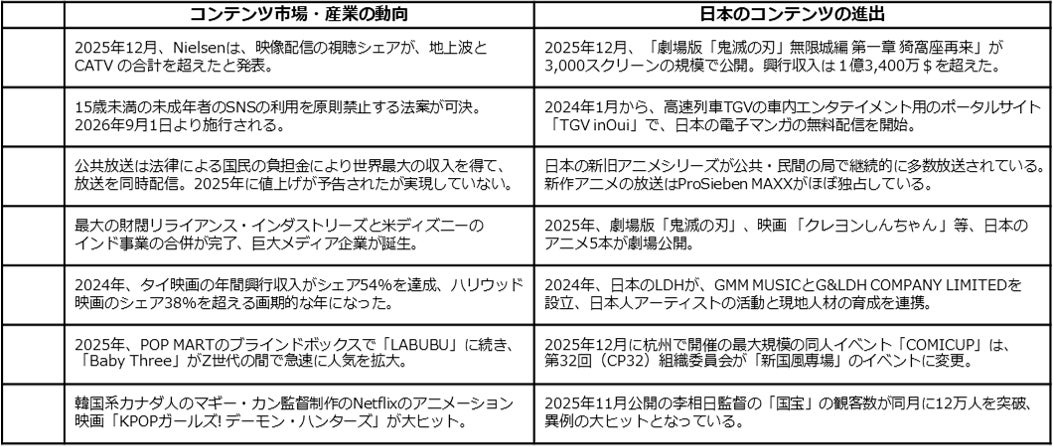 【2024・25年の世界7か国・地域のコンテンツ市場/日本のコンテンツの進出の主なトピックス】