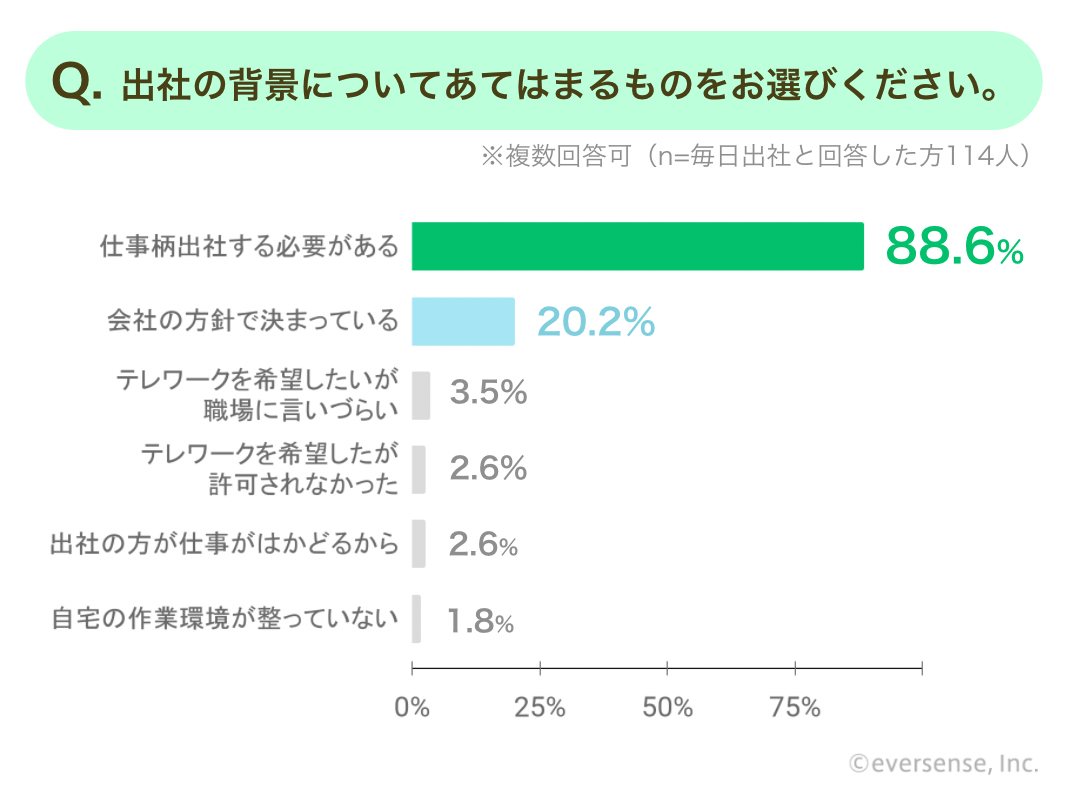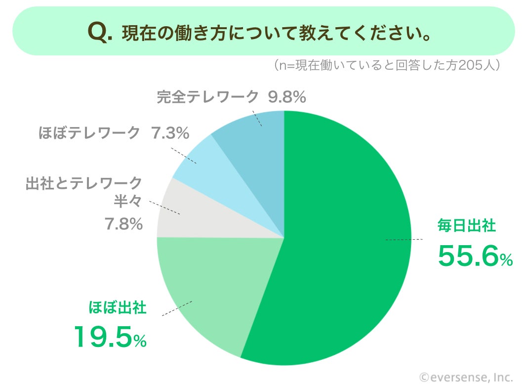 - 働いている人のうち55.6%が「毎日出社」。うち8割は「仕事柄出社する必要がある」と回答。