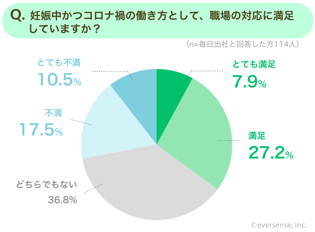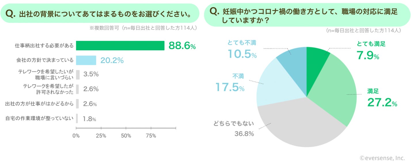 また、現在働いている人のうち半数以上が毎日出社しており、不安な感染ルートも職場が1位となっています。職場の対応においても、満足と言えない人が6割。妊婦本人だけではなく、夫・パートナーの働き方も考慮してほしい、という声もありました。最後に、アンケートに寄せられた不安や要望などのコメントも一部紹介しています。