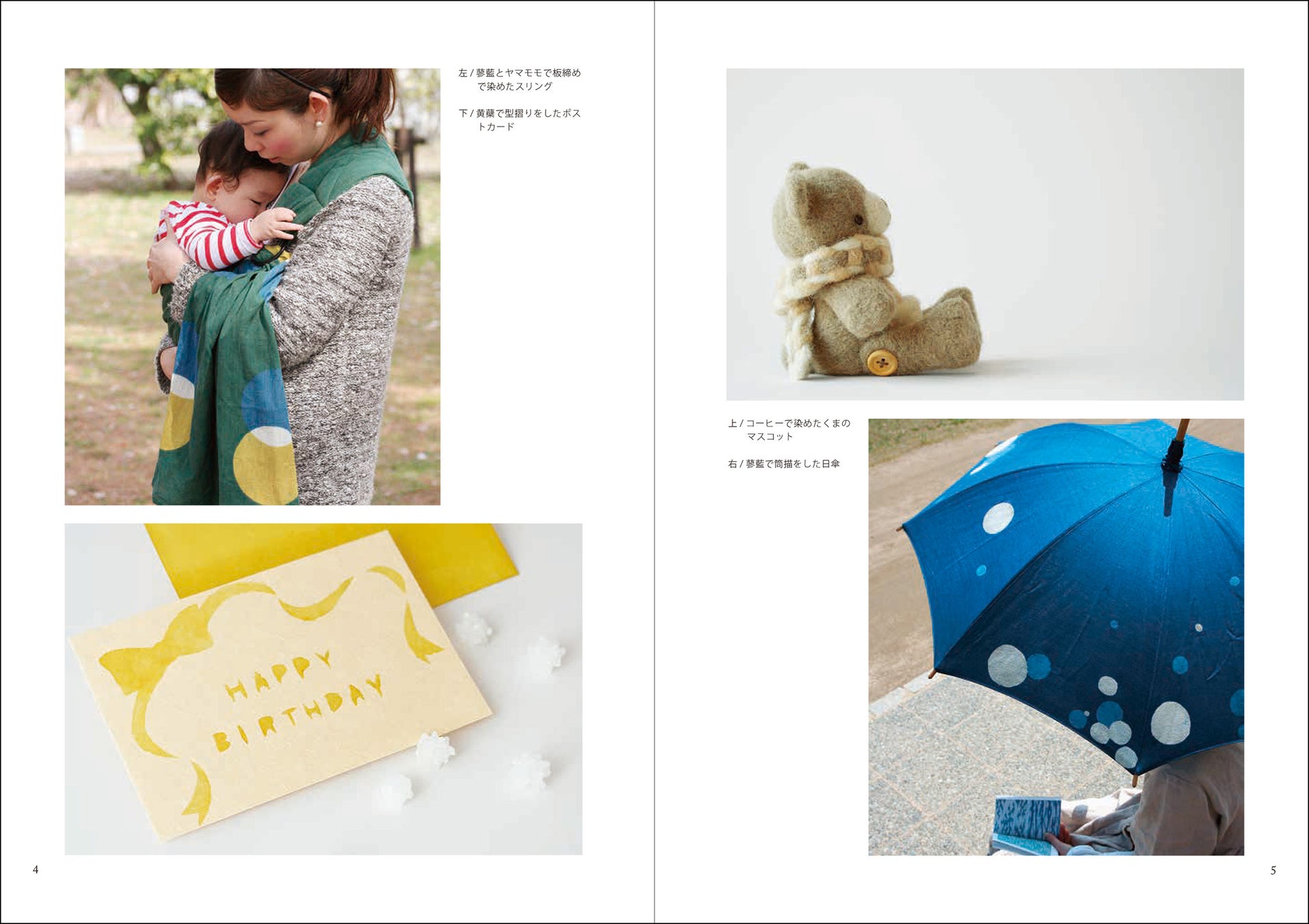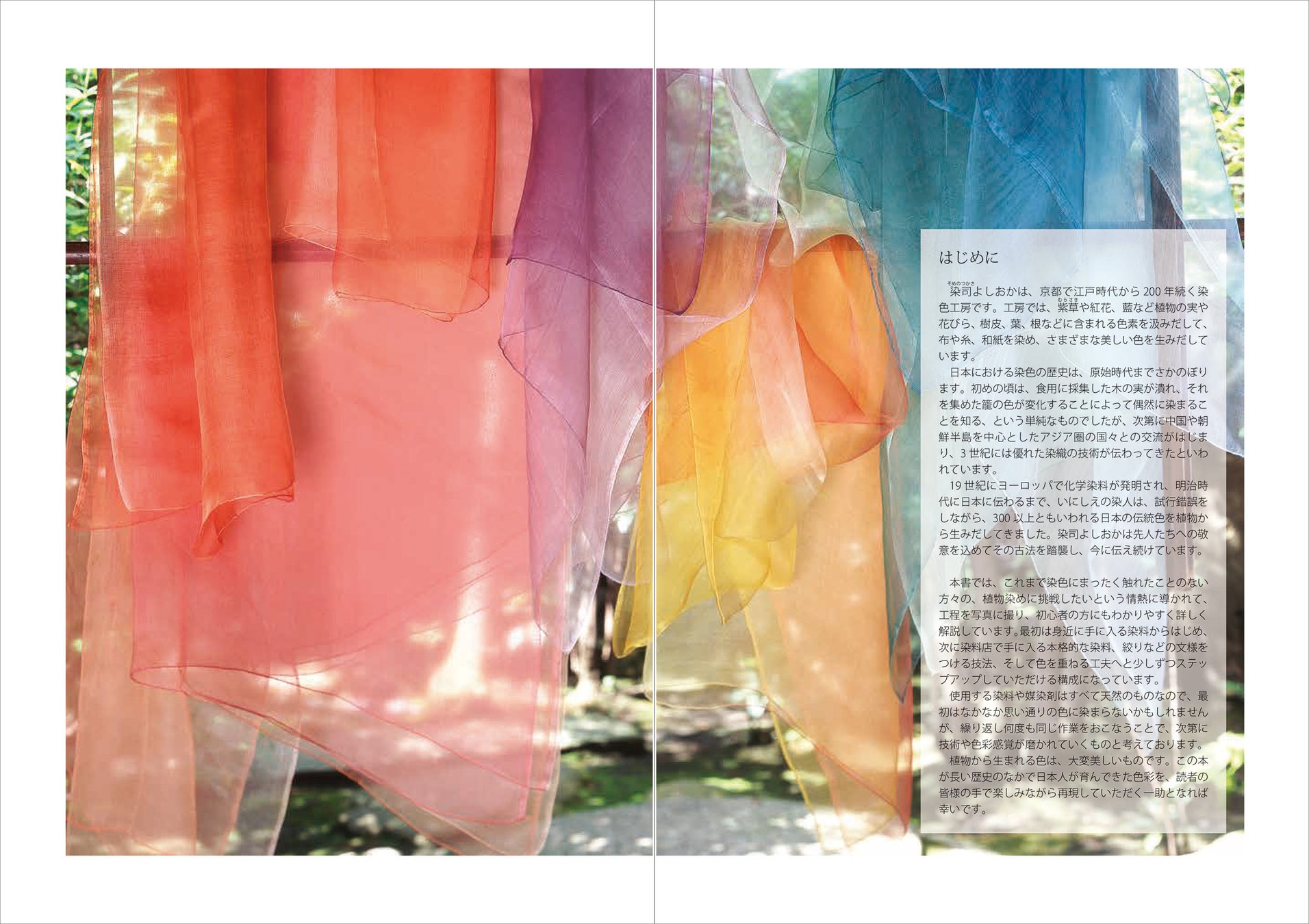 本書では、一年間にわたって、染司よしおかの工房から学んだ植物染めの技法を、基本から応用まで詳しくご紹介します。はじめて植物染めに挑戦される方に向けて、まずは道具や布選びから始まり、各工程を写真とともにもわかりやすく解説しています。身近な染料であるタマネギ、ドングリ、コーヒー、栗のイガ、ヨモギから、ワンランク上の刈安(かりやす)、蘇芳(すおう)、茜、紅花、藍へと、徐々に染料の選択や染色技法をステップアップできる構成になっています。自然の恵みを受け取りながら、連綿と美しい色を生み出してきた染司よしおかに、本格的に学ぶことができる一冊です。