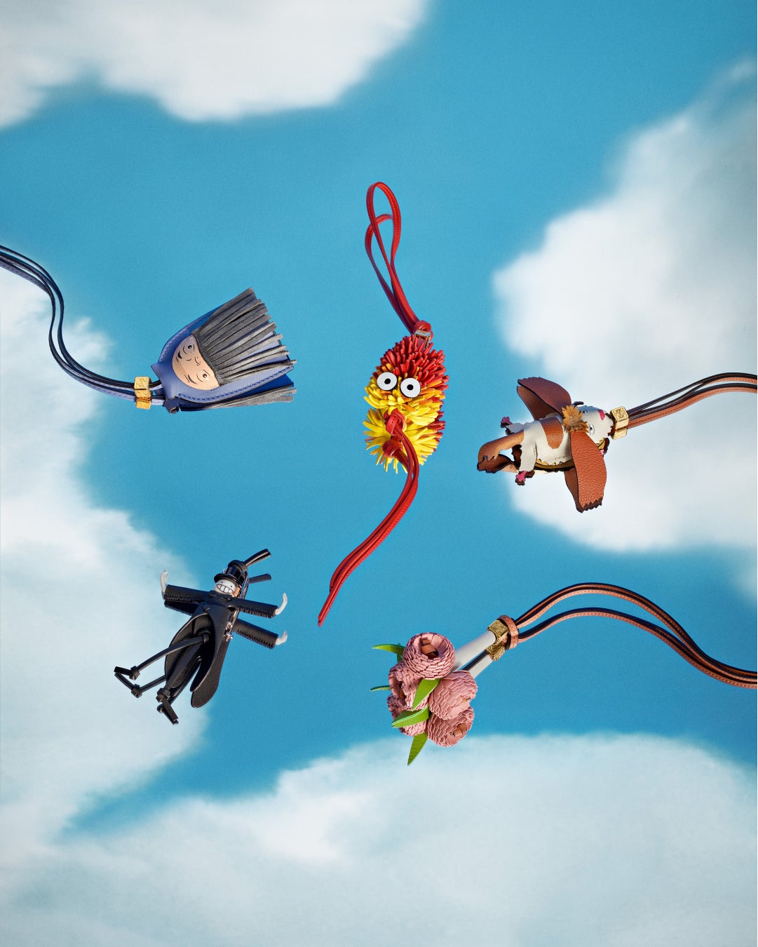 ロエベ×スタジオジブリ 『ハウルの動く城』カプセルコレクションでは、ソフィーやハウル、さらに炎の悪魔カルシファーやマルクル、ヒン、かかしのカブ、荒れ地の魔女など、映画に登場するおなじみのキャラクターが、レザーやシアリング、上質な生地の上に、インターシャ、刺繍、象嵌などの手法を用いて、生き生きと描き出されます。キャラクターたちは、ブランドのアイコンバッグである、パズルやフラメンコ、ハンモックやアマソナ、ルナやブレスレットポーチをはじめ、様々なレザー小物、ジャンパー、ジャケット、シャツなどのウェアにまで姿を現し、アップリケやラフィア、フェザーなどの趣向が加えるリアルな手触りによって、まるで生きているかのようです。映画のワンシーンがツイードジャケットでは裏地に、シャツやショートパンツでは全面にプリントされます。カーディガンにあしらわれたフェザーは魔法のように舞い踊り、いくつかのシルエットは作中の人物を思わせます。さらには「城」自体もバッグとして登場します。パズルやフラメンコ、アマソナ、ハンモックなどのシグネチャーバッグの断片や余りをコラージュし、独自のフォルムで城を形づくりました。